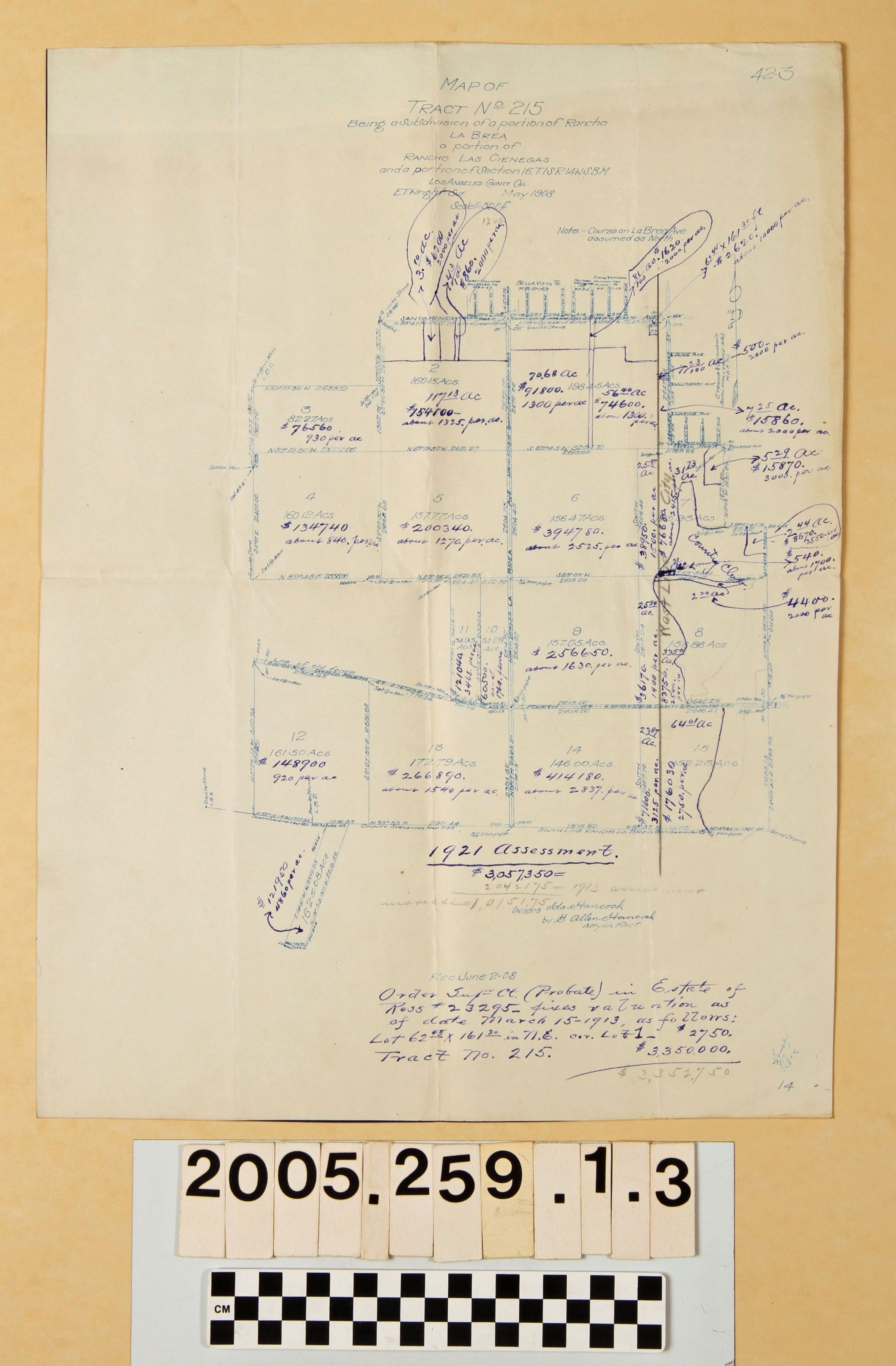 MAP, "MAP OF TRACT NO. 215, BEING A SUBDIVISION OF A PORTION OF RANCHO LA BREA ...," E. T. Wright, Los Angeles County Surveyor, May 1908, with assessment figures from 1921 written in blue ink and comparisons made to 1913 assessment totals. In good condition.Lexicon