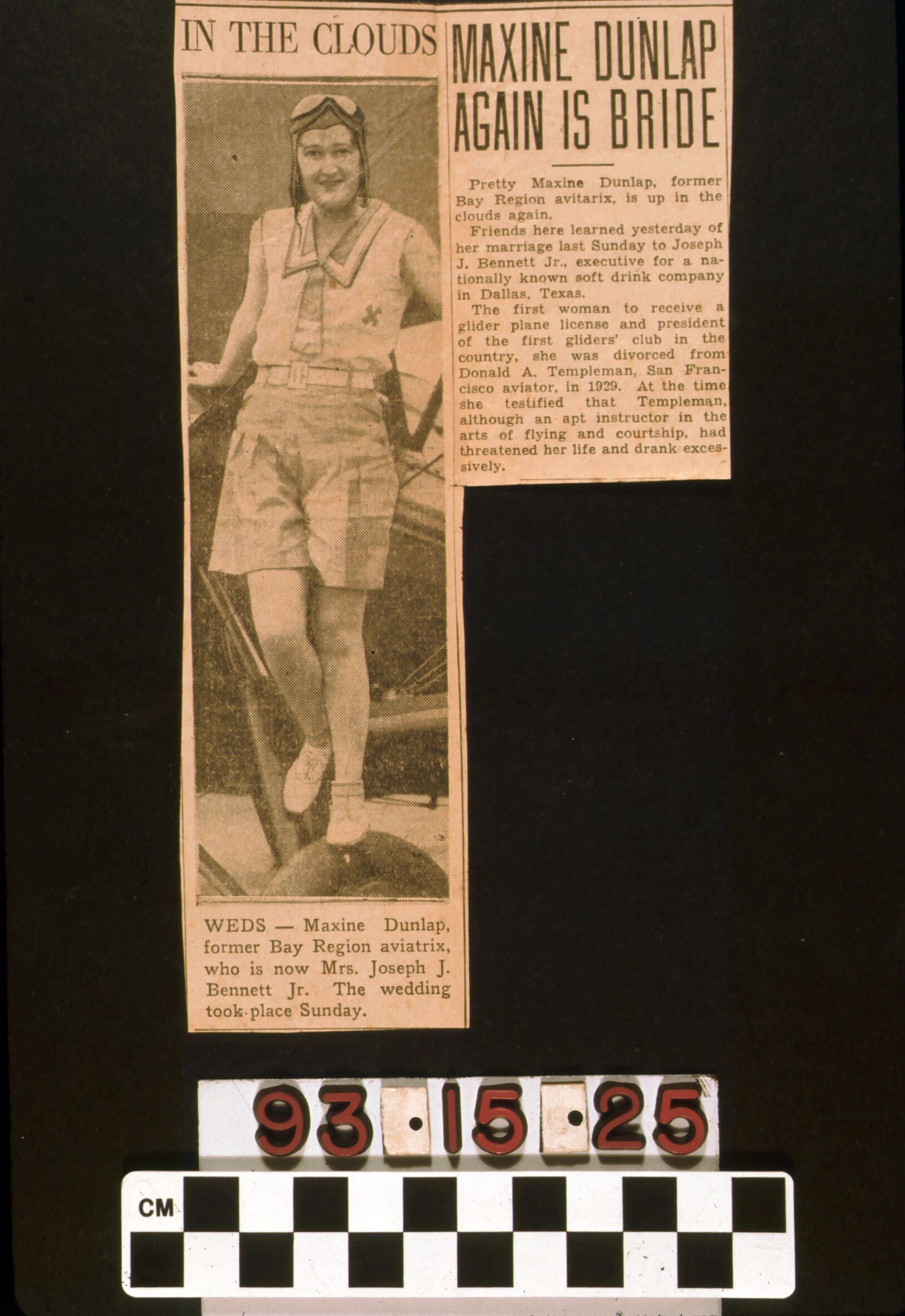 A newspaper clipping from the 17 October 1934 issue of an unidentified newspaper regarding the marriage of aviator Maxine Dunlap. Accompanied by a photograph of Ms. Dunlap. From the collection of Marian Trace. Condition good. None.