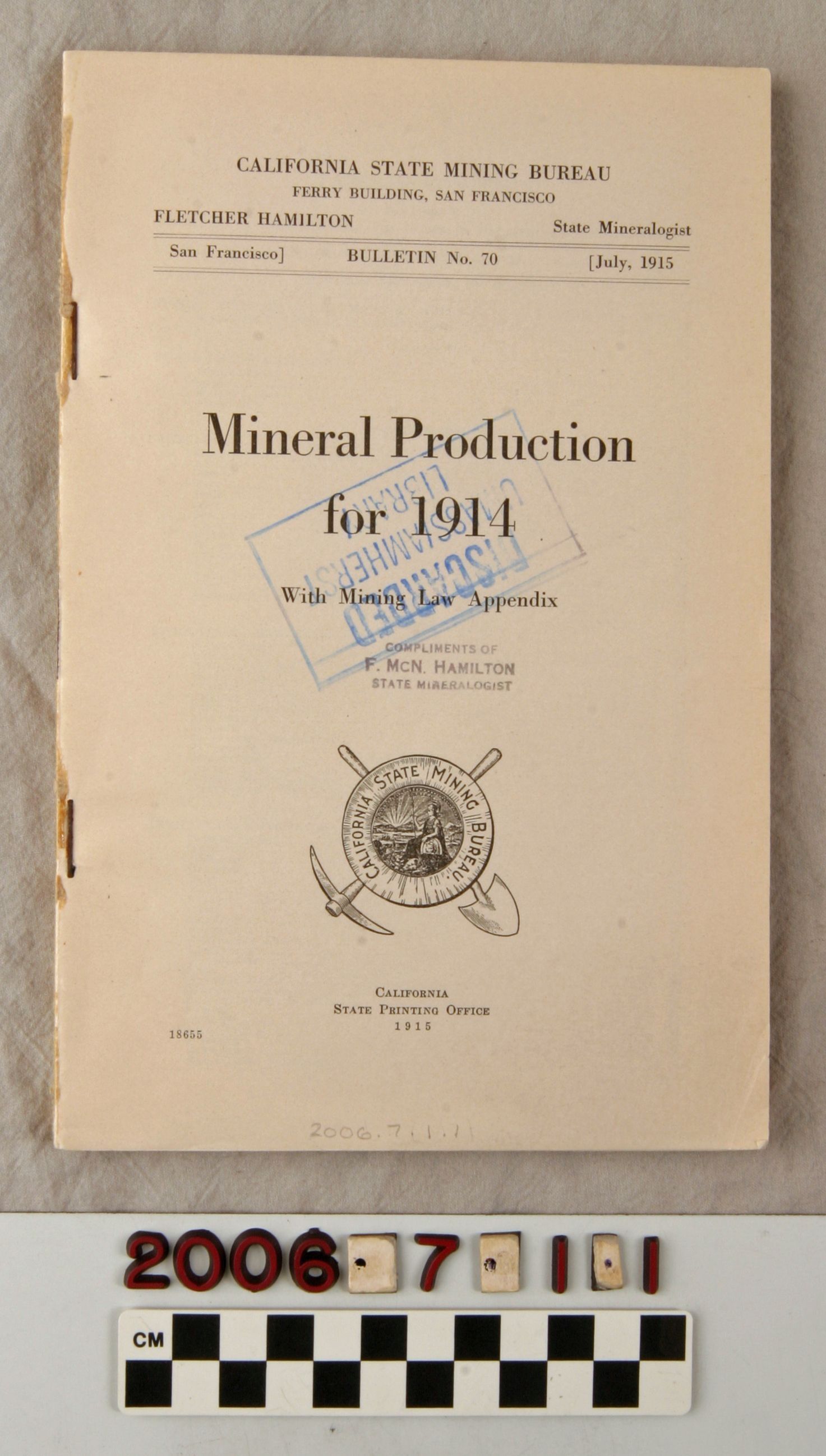 "MINERAL PRODUCTION FOR 1914," California State Mining Bureau, Bulletin No. 70, July 1915 (Sacramento: California State Printing Office,) 1915. The document provides a summary of the mineral industry with tables showing production and values for 1913 and 1914, as well as specific sections on fuels, metals, structural materials, industrial materials and salines, a list of activity by county, and appendices with the state's mining laws, bureau publications, and county maps. Lacking covers, but having a tight binding and clean pages, the condition is fair.Lexicon