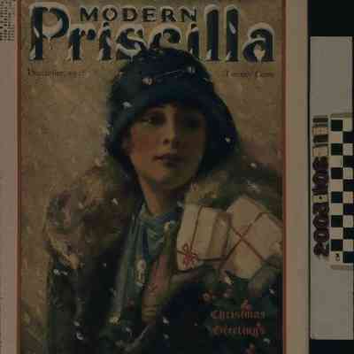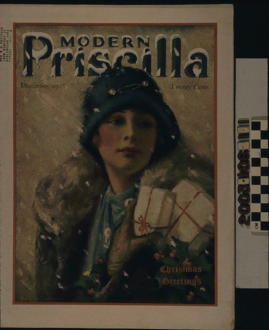 "Modern Priscilla," December 1928 issue, published by The Priscilla Company, Boston. The front cover has the title, month and year of the issue, and its price at the top. At the center is a color image of a woman in a snowy scene, wearing a blue cloche hat, fur trimmed coat, and holding two white Christmas packages with red ribbon. At the bottom right are the words "Christmas / Greetings" in red letters. Articles include Christmas-related fiction, as well as on topics like needlework for furnishings; needlework Christmas gifts for children and men; rugs for the house; color in interior decoration; Christmas dinner and other recipes; floor cleaning items; cooking tools and equipment; women's fashions; and jewelry making. There are many black and white and a few color illustrations and many advertisements throughout. A table of contents is at the rear of the 52-page periodical. At the top left corner of the front is a stamped address label. In good condition, the item has acid burns on the top and right edge of the front; light cover creases; dogeared corners; light soiling on the cover; a fold at the top right corner of the front; minor foxing on the lower right corner of the front; a slightly musty smell; small cover stains and on some pages; and small spine tears.Lexicon