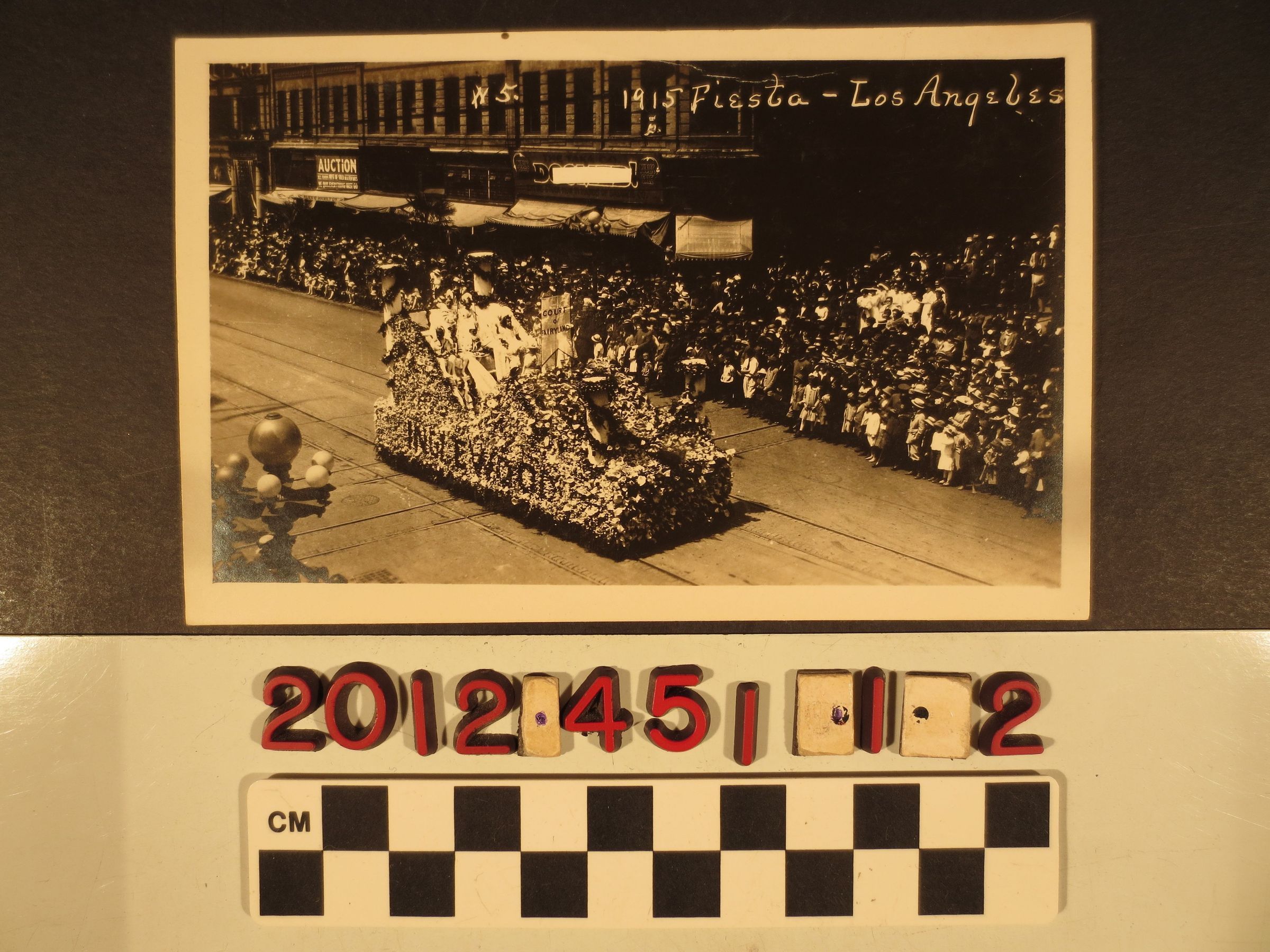 A real photo postcard, "N5 1915 Fiesta -- Los Angeles." The image is taken from an elevated position overlooking a downtown street with portions of some commercial buildings on the opposite side in view and the sidewalk jammed with onlookers. Riding down the street is the entry from Inglewood titled "Court of Fairyland," with the court composed of young boys and girls on the flower-bedecked vehicle. On the reverse is an encomium about Inglewood as "a grand place to raise poultry," With minor soiling and edge rubbing, the condition is good.