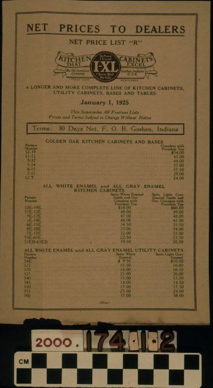 Color: Brown "Net Price List 'R'," issued by the I-XL Furniture Company, January 1, 1925. The brown paper sheet has a double-line border on both sides. Across the top of the front is, "NET PRICES TO DEALERS." Below this is the title, company logo, and the words, "A LONGER AND MORE COMPLETE LINE OF KITCHEN CABINETS, / UTILITY CABINETS, BASES AND TABLES." At the center is a note reminding customers that all prices and terms are subject to change. Listed at the bottom and on the back are the catalog numbers and prices for kitchen cabinets and bases; utility cabinets; tables; and porcelain table-tops. At the bottom of the back is the name and location of the company. The list corresponds to the catalog which is item 2000.174.1.1. With a fold down the side, and tears and stains along the bottom, the object is in overall fair condition.
