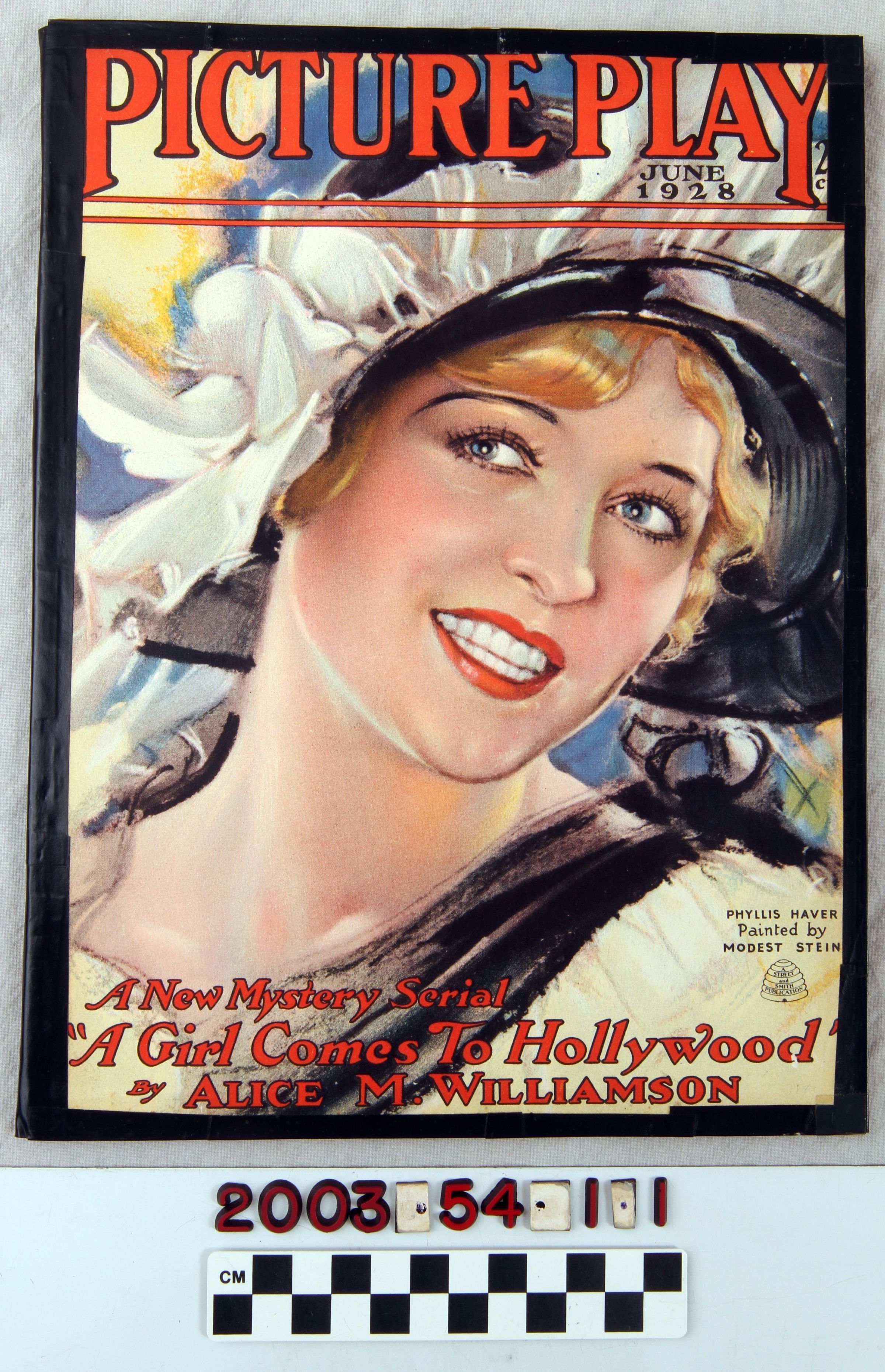 "Picture Play," June 1928, published by Street & Smith Corporation, New York. The front cover has the title in red letters at the top with the issue date and price in smaller black letters below and to the right. The title of a serial fictional piece and the author's name is at the bottom. A painting by Modest Stein of actress Phyllis Haver forms the backdrop for the cover. Contents include items on specific films; photographs of stars before they became famous; springtime fashions as worn by actresses; articles on specific stars and their personal lives; articles by industry observers; industry news; and others. There are many photographs of star portraits and film scenes, as well as many advertisements, some of them by film companies showing stars and identifying new films. With the cover edges covered in black tape; some interior pages taped where tears occurred; page browning; surface soiling; a hole at the bottom of page one; and small tears along brittle edges on some pages, the overall condition is fair.Lexicon
