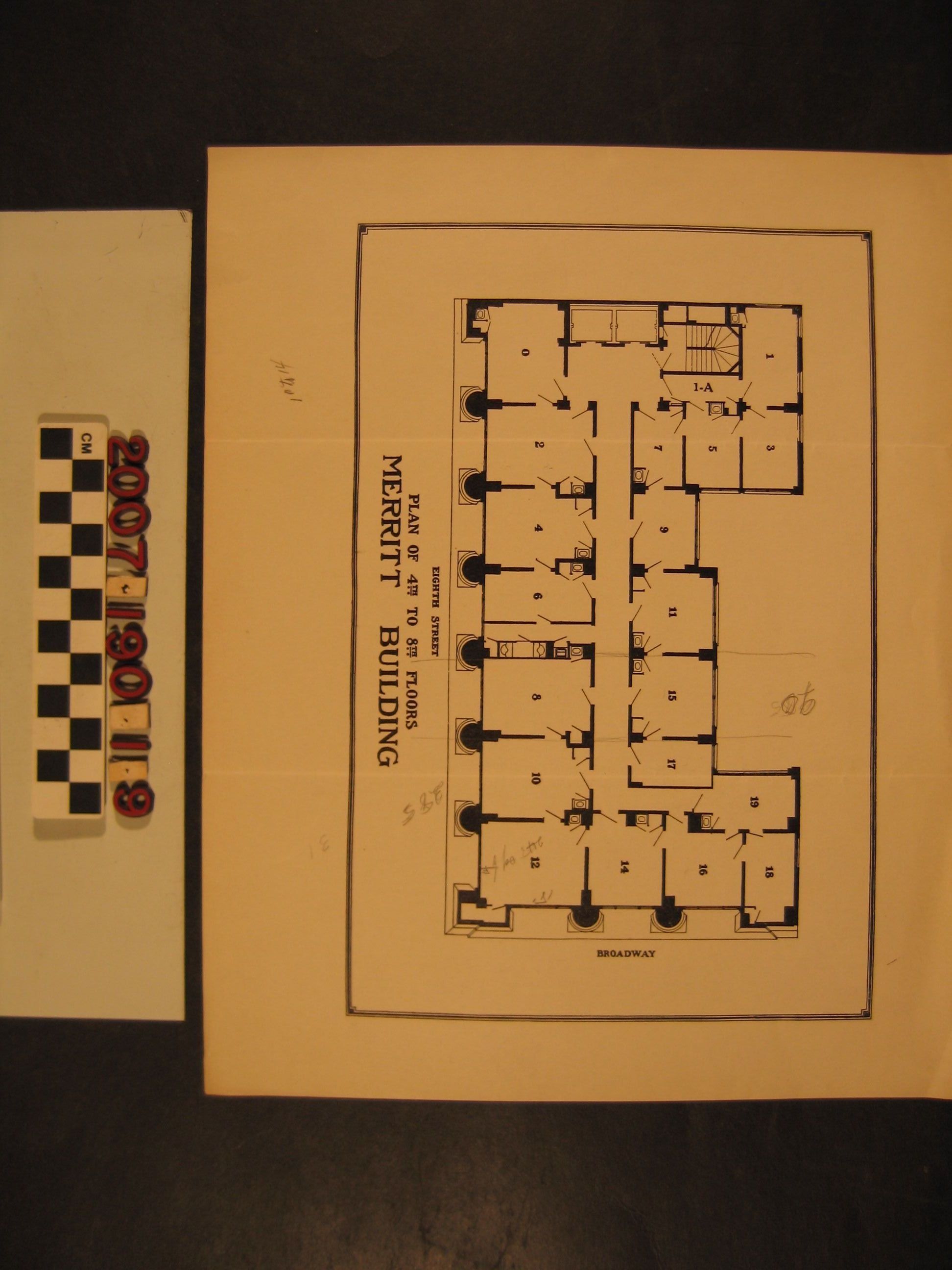 "Plan of 4th to 8th Floors, Merritt Building," Los Angeles, ca. 1912. The item shows the building at the corner of Eighth Street and Broadway, where it still stands, and the nineteen suites, stairwells, water closets, doorways and swings, and other features. There are some pencil notations on the item. Printed on the reverse are conditions 11 through 18 concerning leases, assumed to be of this building. With folds, creeses, light soiling, and light browning, the overall condition is good.