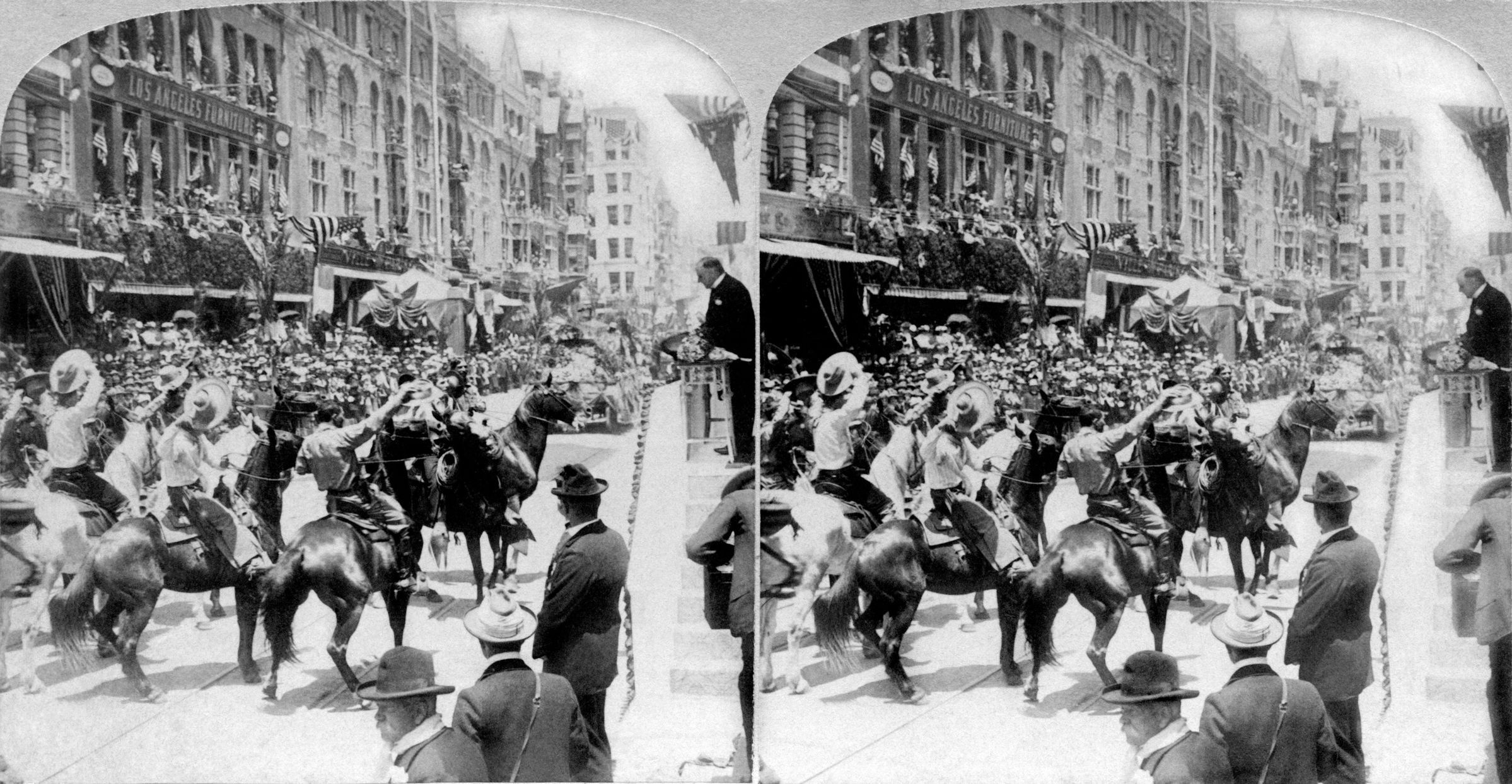 "'Rough Rider' Cowboys saluting President McKinley -- reception at Los Angeles, Cal," May 1901, published by Underwood and Underwood. The view shows several men on horseback issuing salutations to the president, who stands at right at the edge of a reception box. Some spectators are in the foreground and the parade continues in the background. Some commercial structures are shown with decorations and crowds line the street. With some soiling and edge rubbing, the condition is good.Lexicon