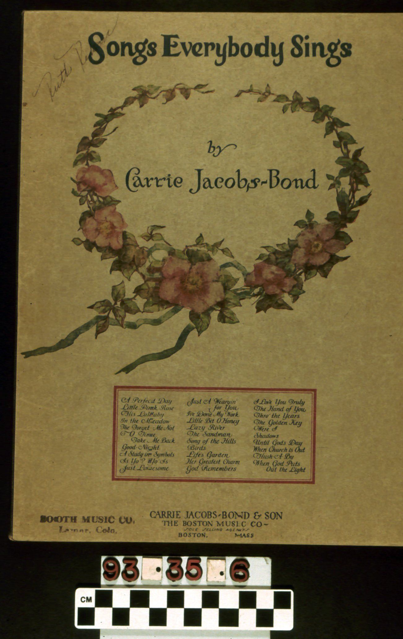 Songbook- "Songs Everybody Sings" by Carrie Jacobs-Bond (Boston: Carrie Jacobs-Bond & Son), 96 pp. A collection of 30 popular songs with an introduction by the editor, accompanied by five photos. The front cover shows a wreath of flowers with the author's name in the center; the title appears just above this wreath. Below in a red frame are the song titles. On the back cover is a similar wreath with "Bond songs are the key to every heart." in the center. The condition is good with some discoloration, edge wear, and creases. "Ruth Rehm" is handwritten at the top left of the front cover; "Booth Music Co., Lamar, Co." is stamped at the bottom left of the front cover in black ink; "117 West Myrtle, Fort Collins, Co." is hand written at the top left of the back cover.Lexicon
