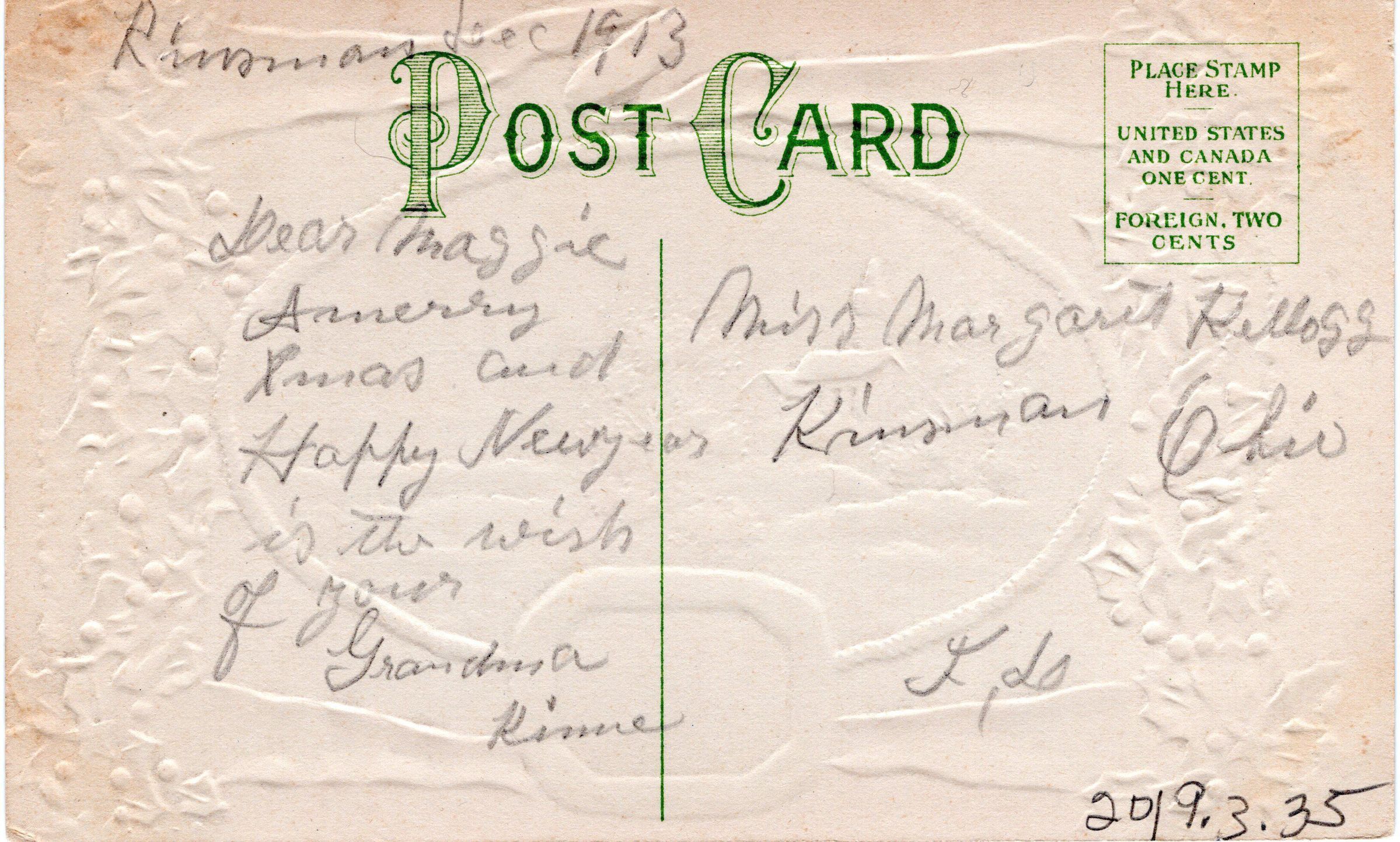 Christmas postcard to Margaret Kellogg from Grandma Kime