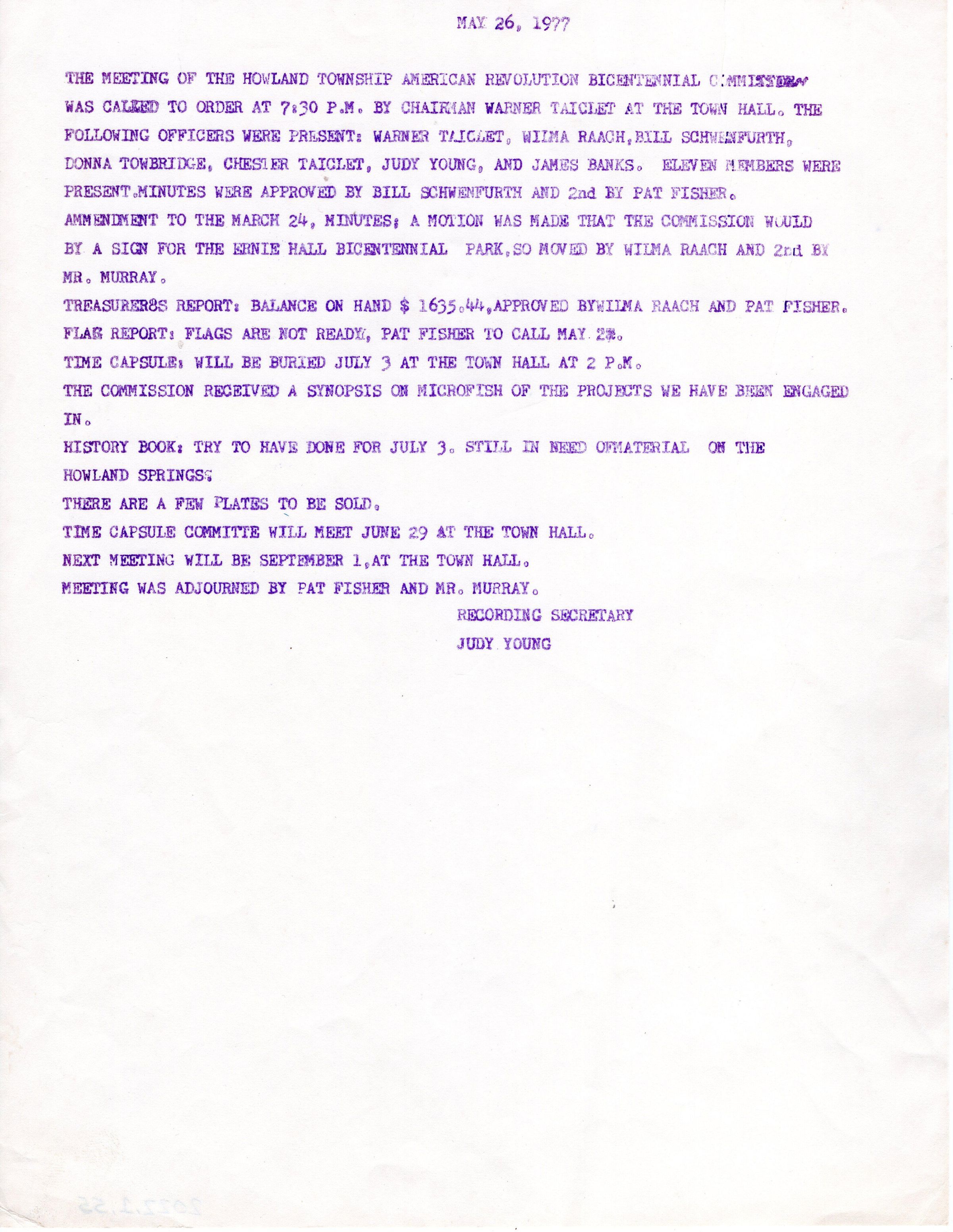Minutes for meeting of the Howland Township American Revolution Bicentennial Commission