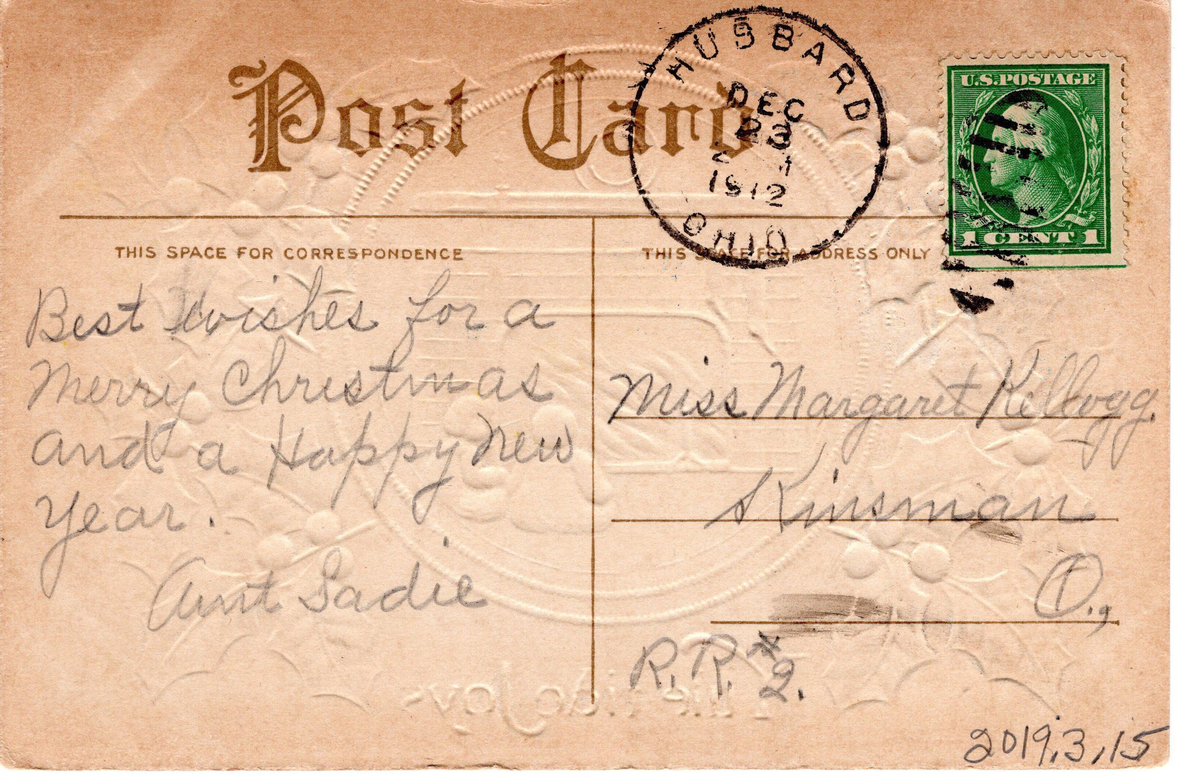 Christmas postcard to Margaret Kellogg from Aunt Sadie