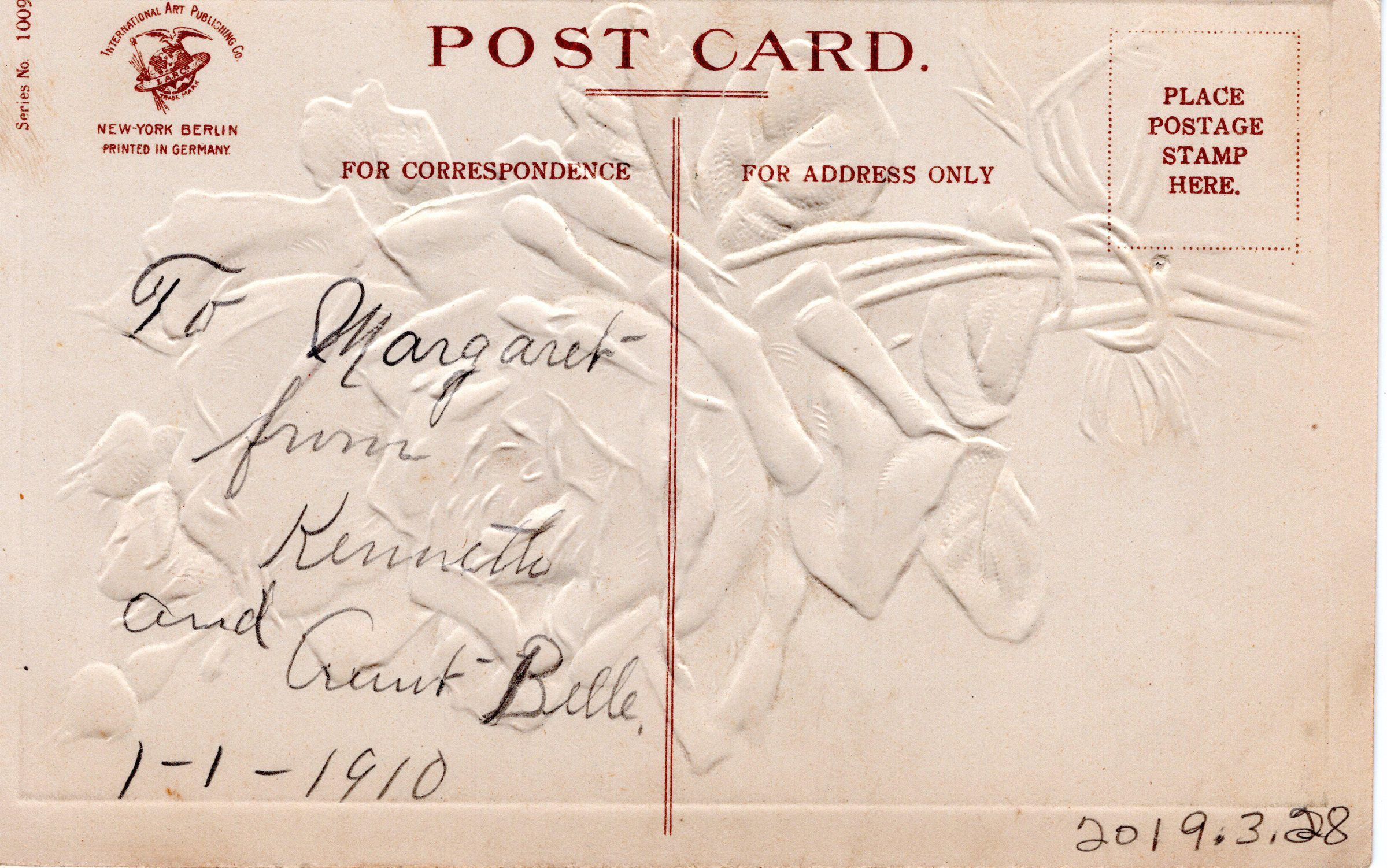 New Year postcard to Margaret from Kenneth and Aunt Belle