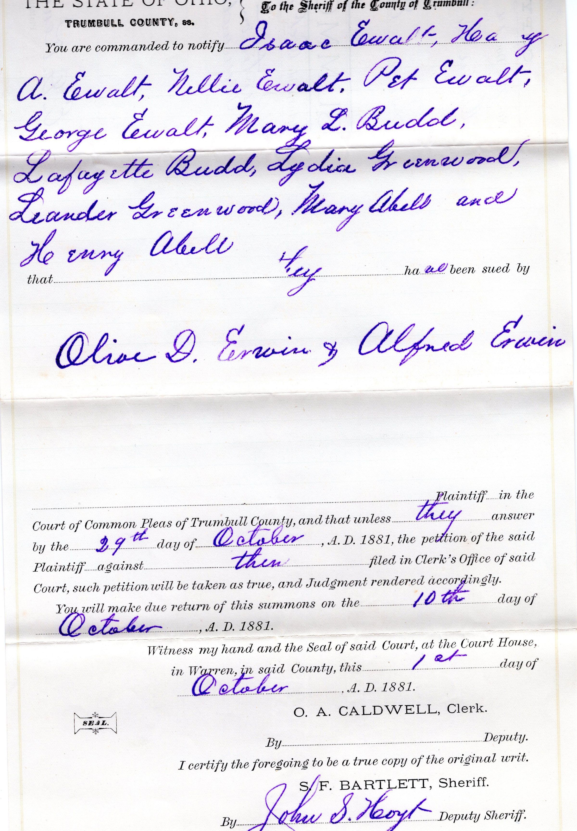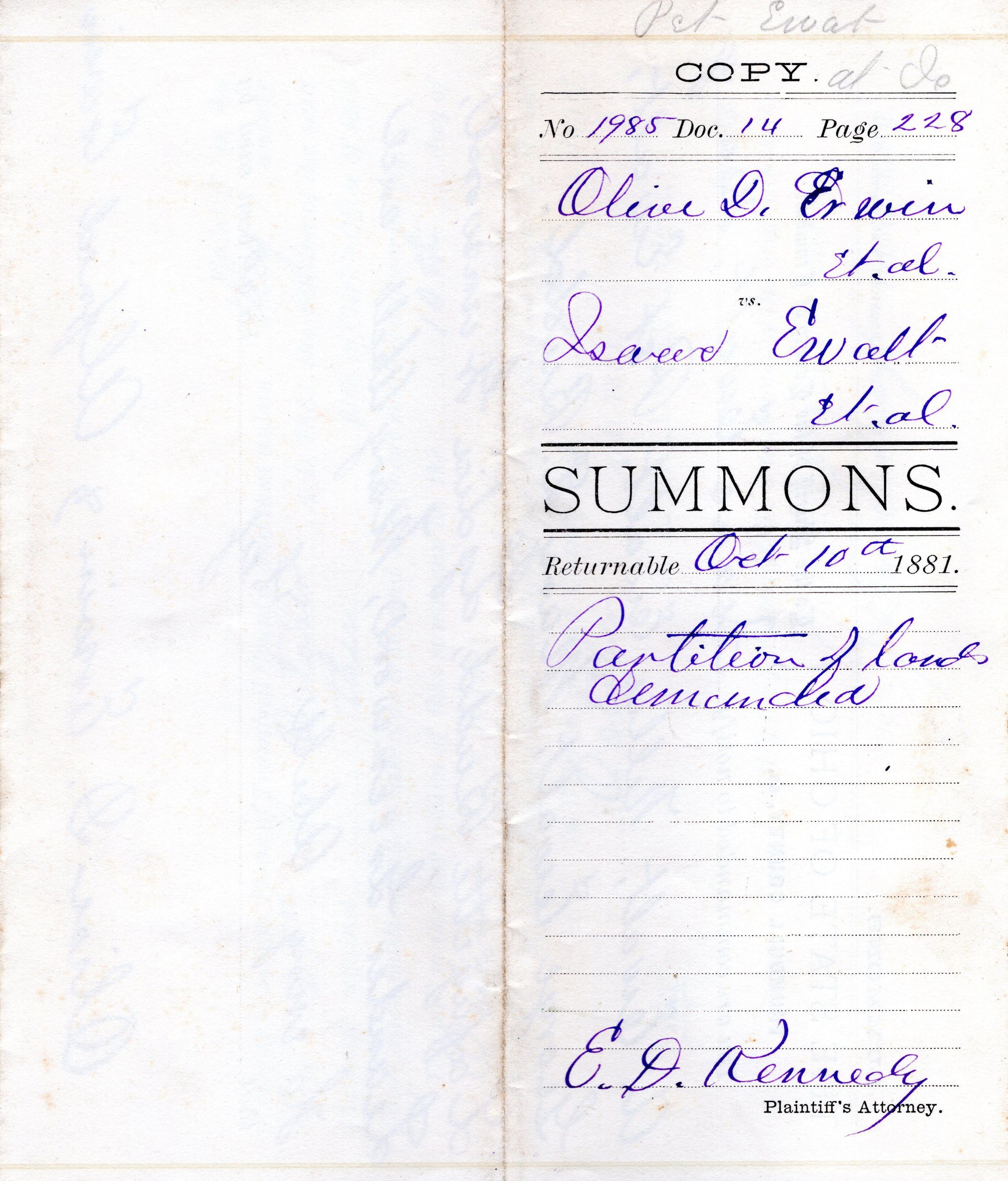 Summons of Olive D. Erwin et.al. vs Isaac Ewalt et.al. Partition of land demanded