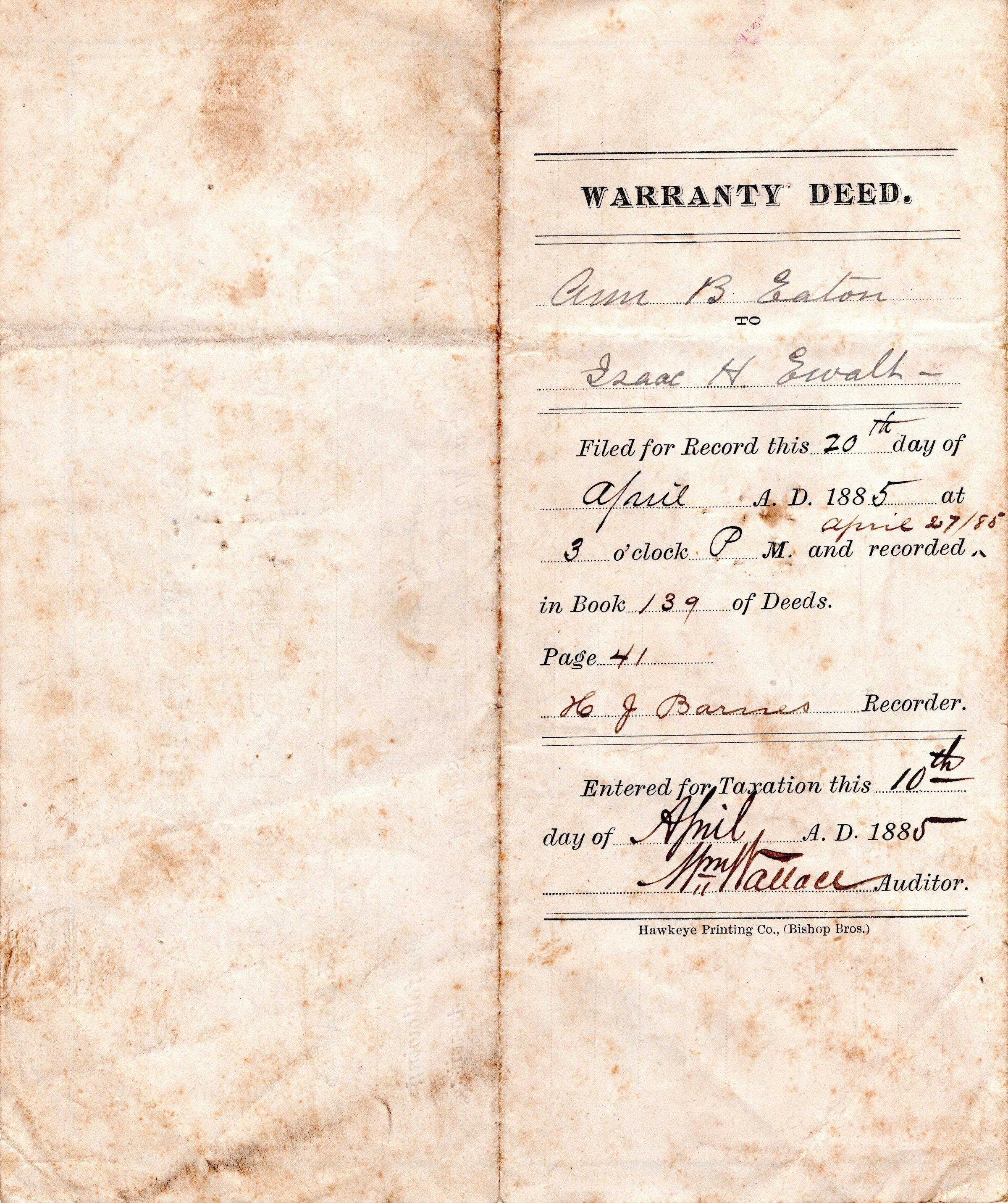 Warranty Deed: Ann B. Eaton to Isaac H. EwaltEntry/Object ID