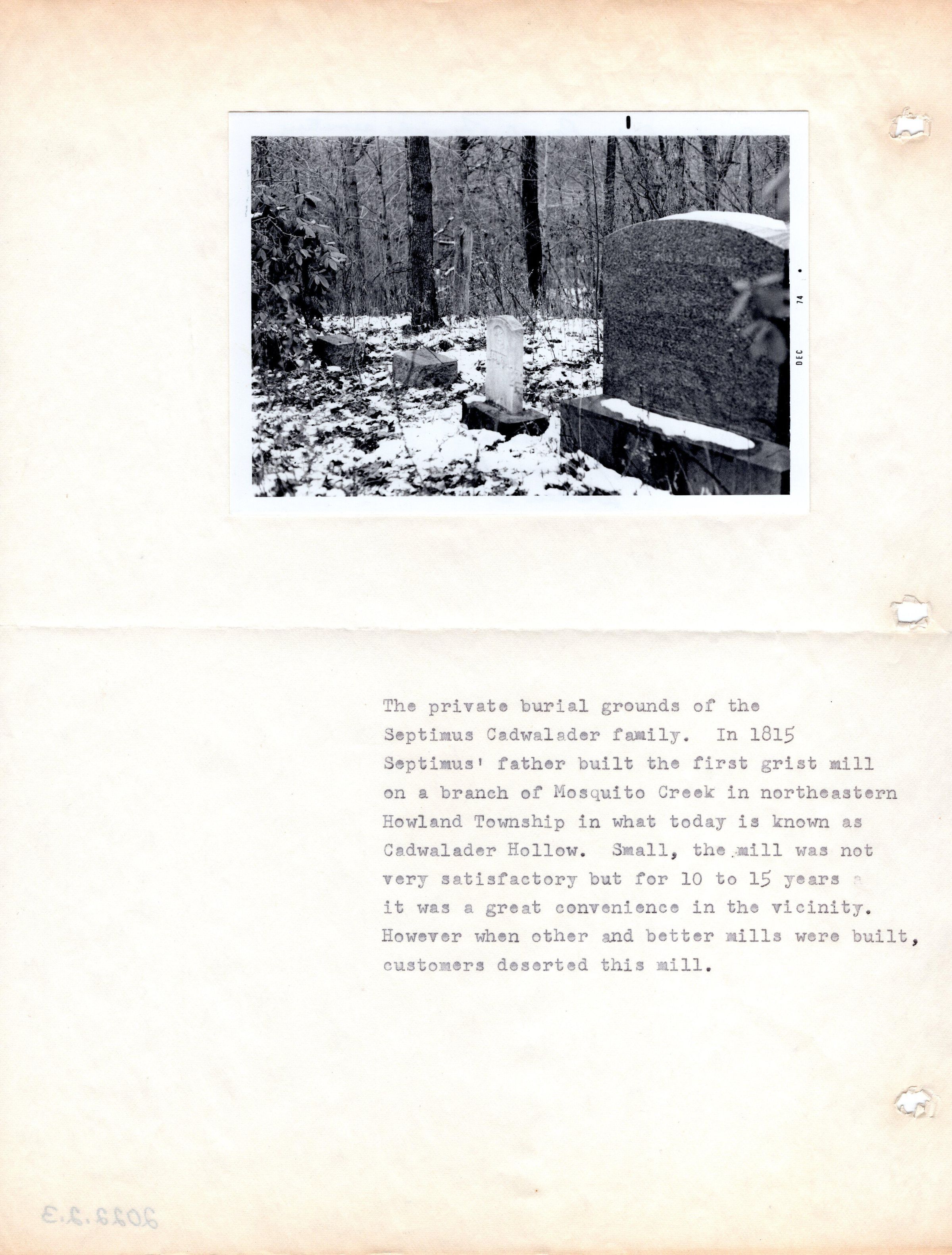 Transcription: The private burial grounds of the Septimus Cadwalader family. In 1815 Septimus' father built the first grist mill on a branch of Mosquito Creek in northeastern Howland Township in what today is known as Cadwalader Hollow. Small, the mill was not very satisfactory but for 10 to 15 years it was a great convenience in the vicinity. However when other and better mills were built, customers deserted this mill.Acquisition