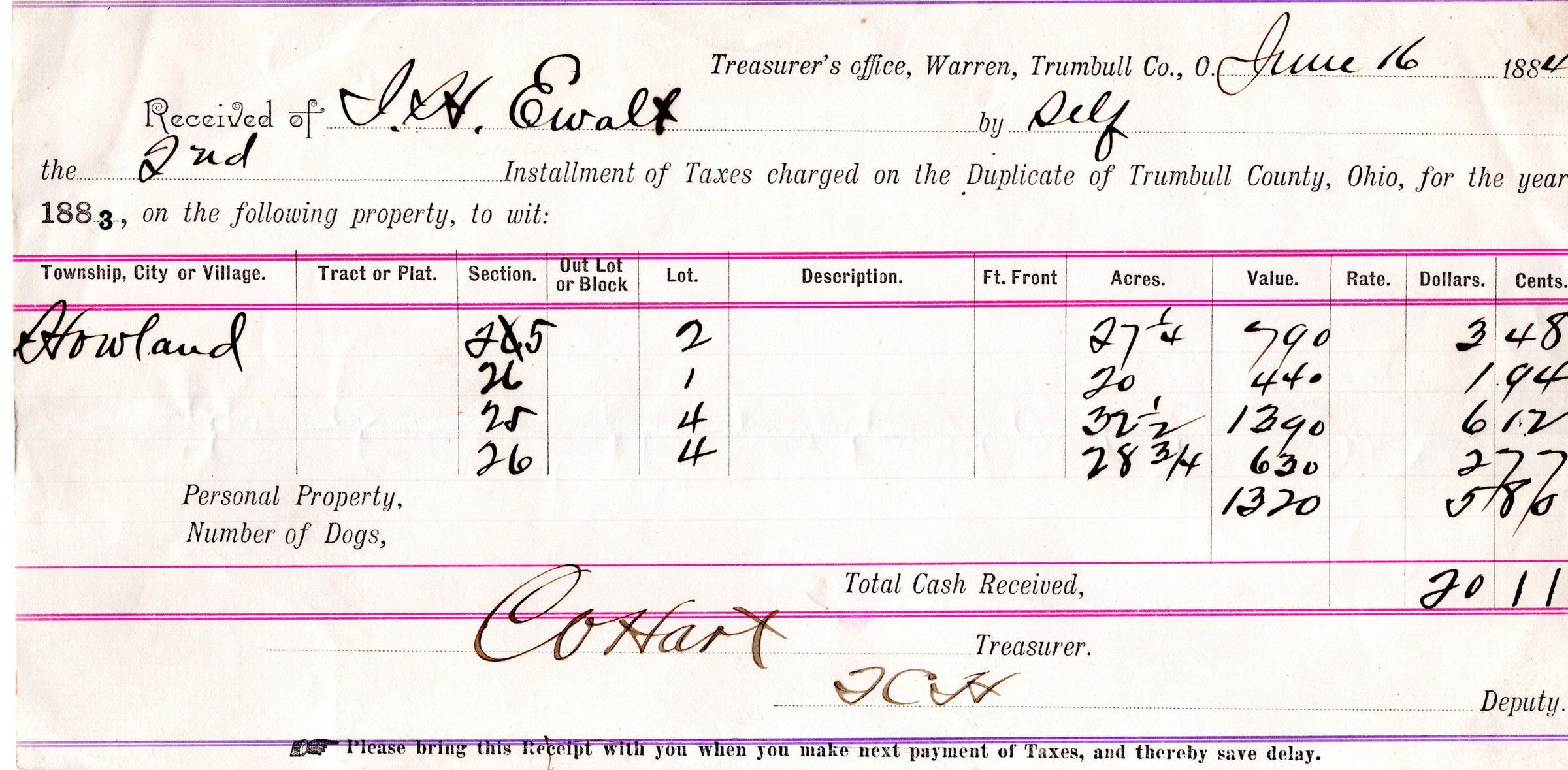 Tax receipt to Isaac H Ewalt for taxes paid to Trumbull County