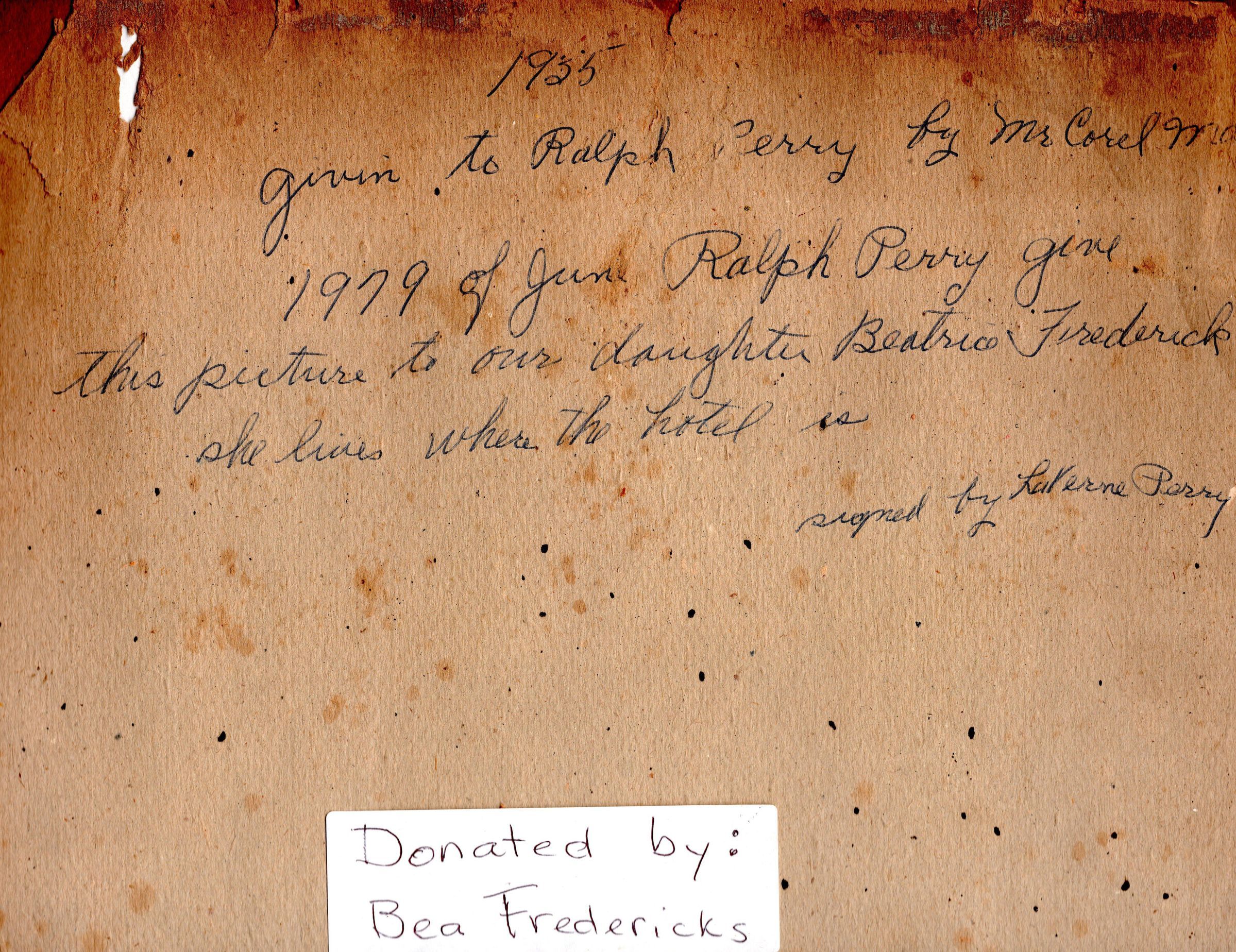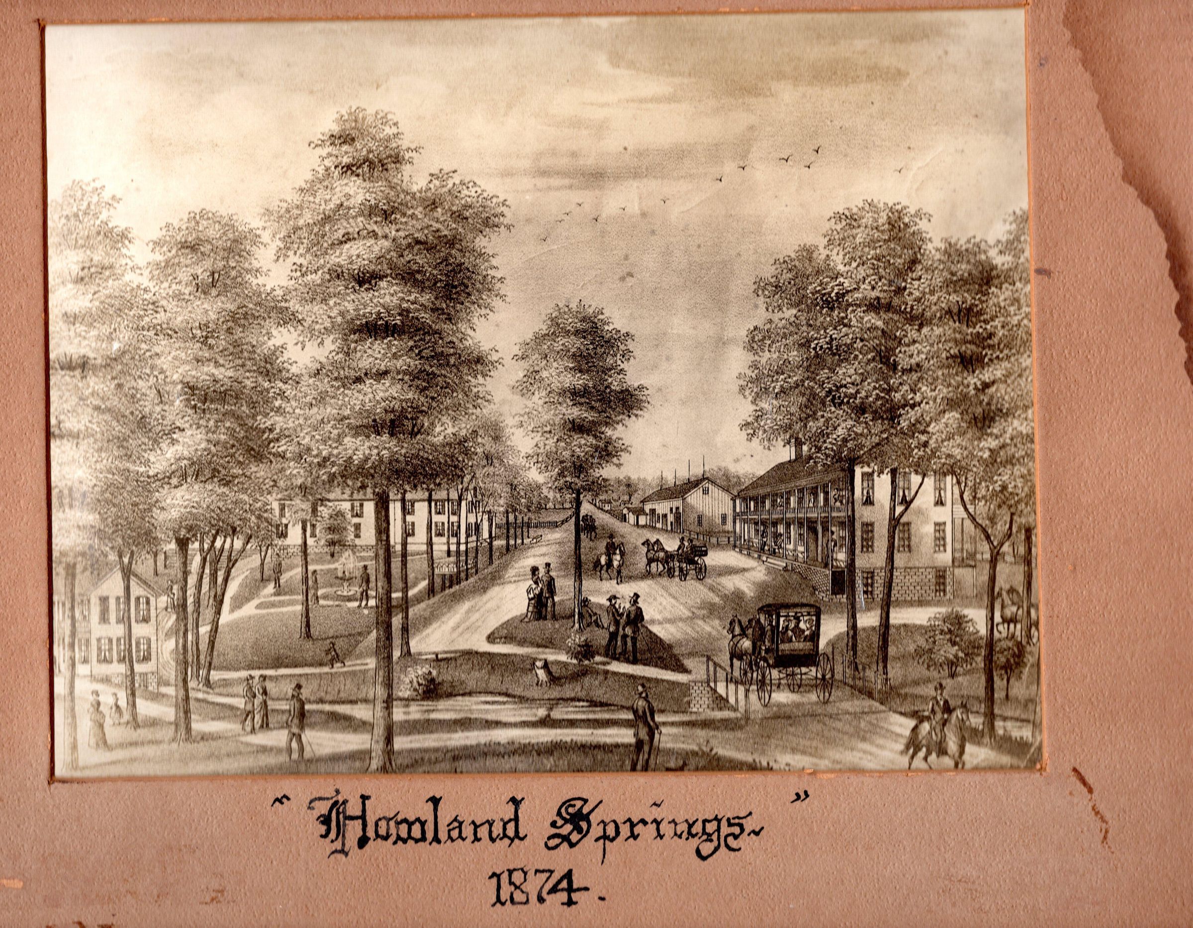 Photo print of Howland Springs. How it looked in 1874.  Given to Ralph Perry by Corel Mackey, a Howland Township Trustee, in 1935.  Ralph Perry gave it to his daughter, Beatrice Fredrick, in 1979.  Bea Fredrick lives where the hotel was located.