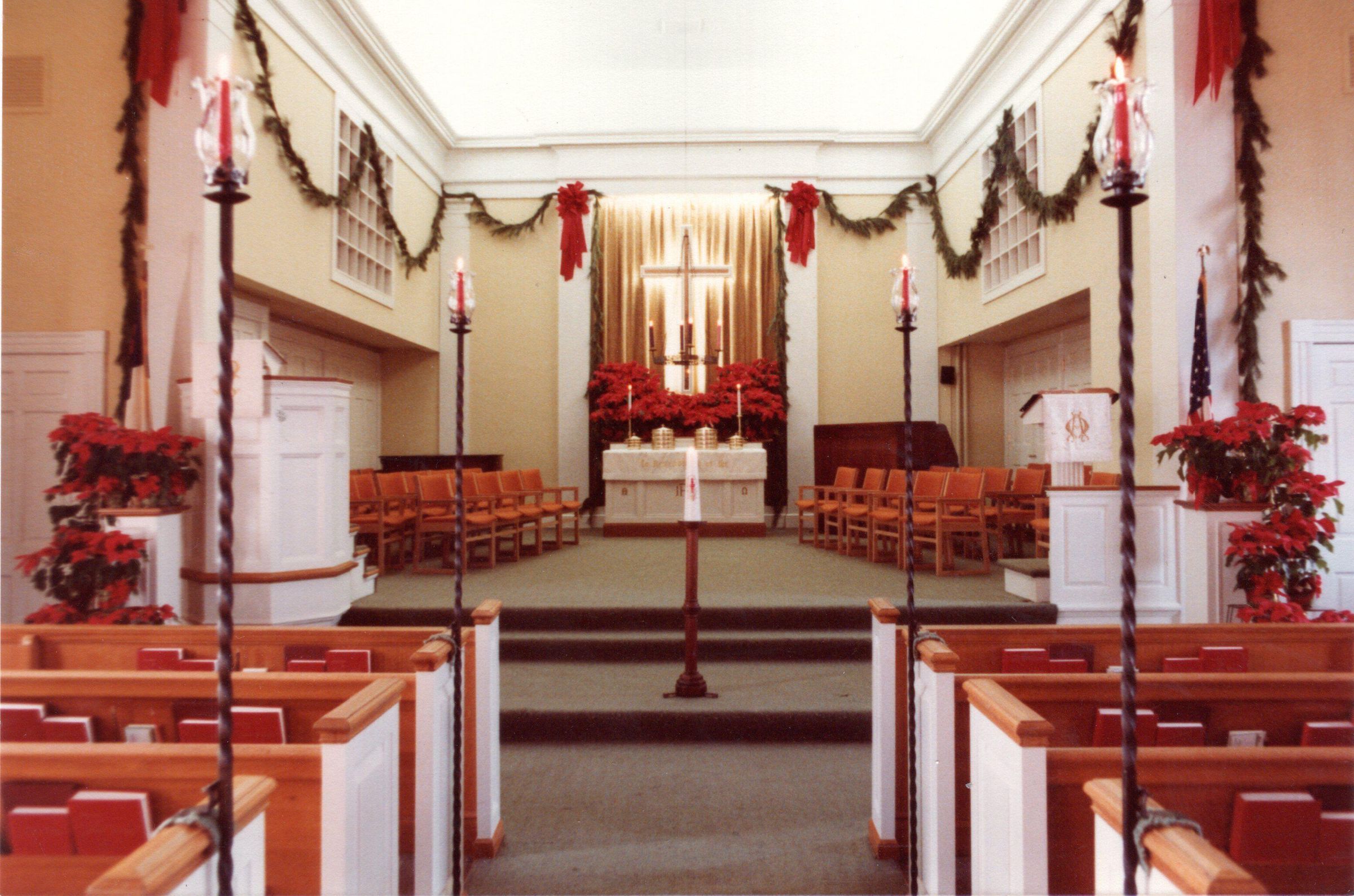 Chapel in Howland Community Church with Christmas decorations.