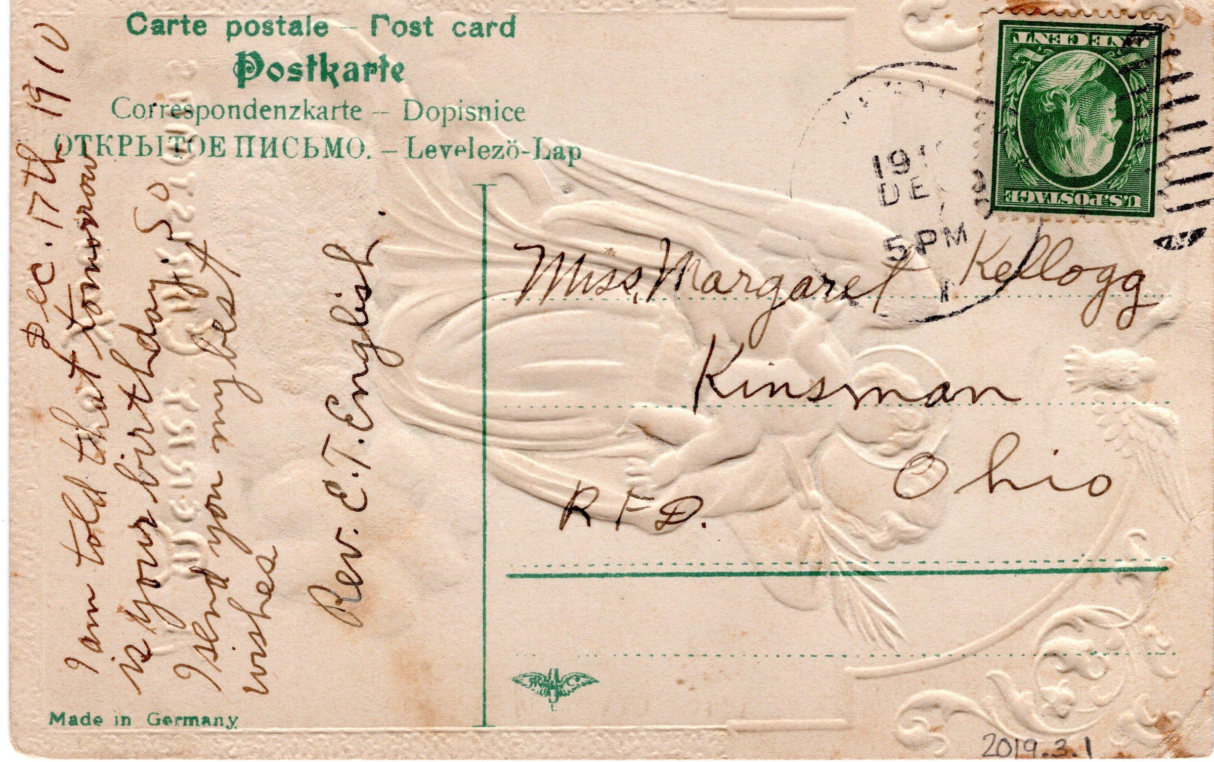 Christmas postcard to Margaret Kellogg from Rev. E.T. English