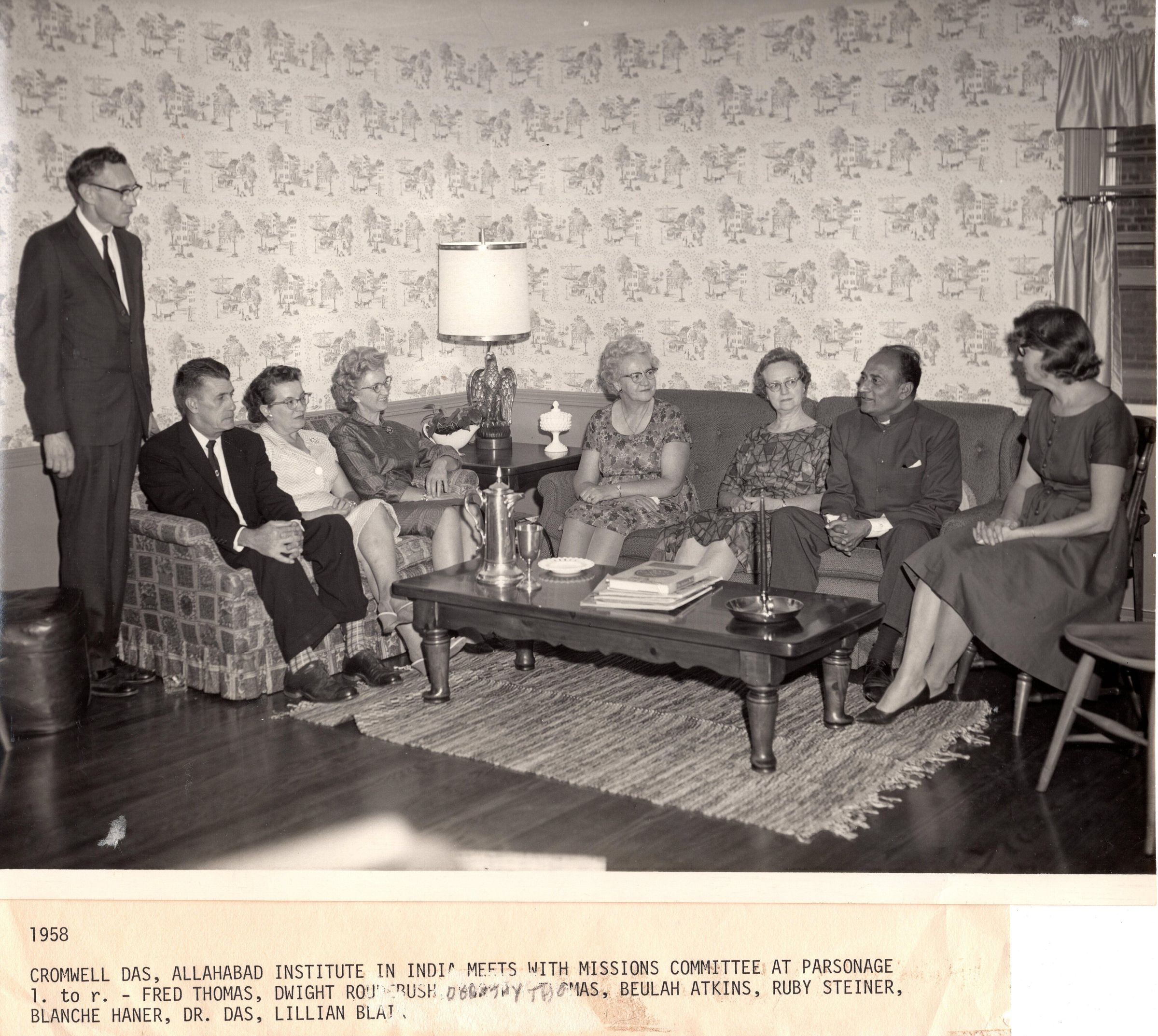 Cromwell Das, Allahabad Institute in India meets with Missions Committee at Parsonage.    Fred Thomas, Dwight Roudebush, Dorothy Thomas, Beulah Atkins, Ruby Steiner, Blance Haner, Cromwell Das, Lillian Blair.