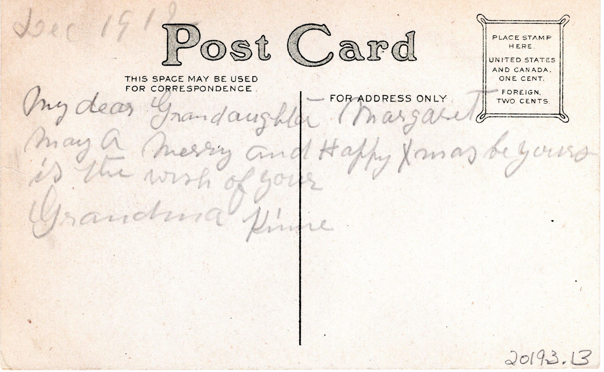 Christmas postcard to Margaret Kellogg from Gramma Kime