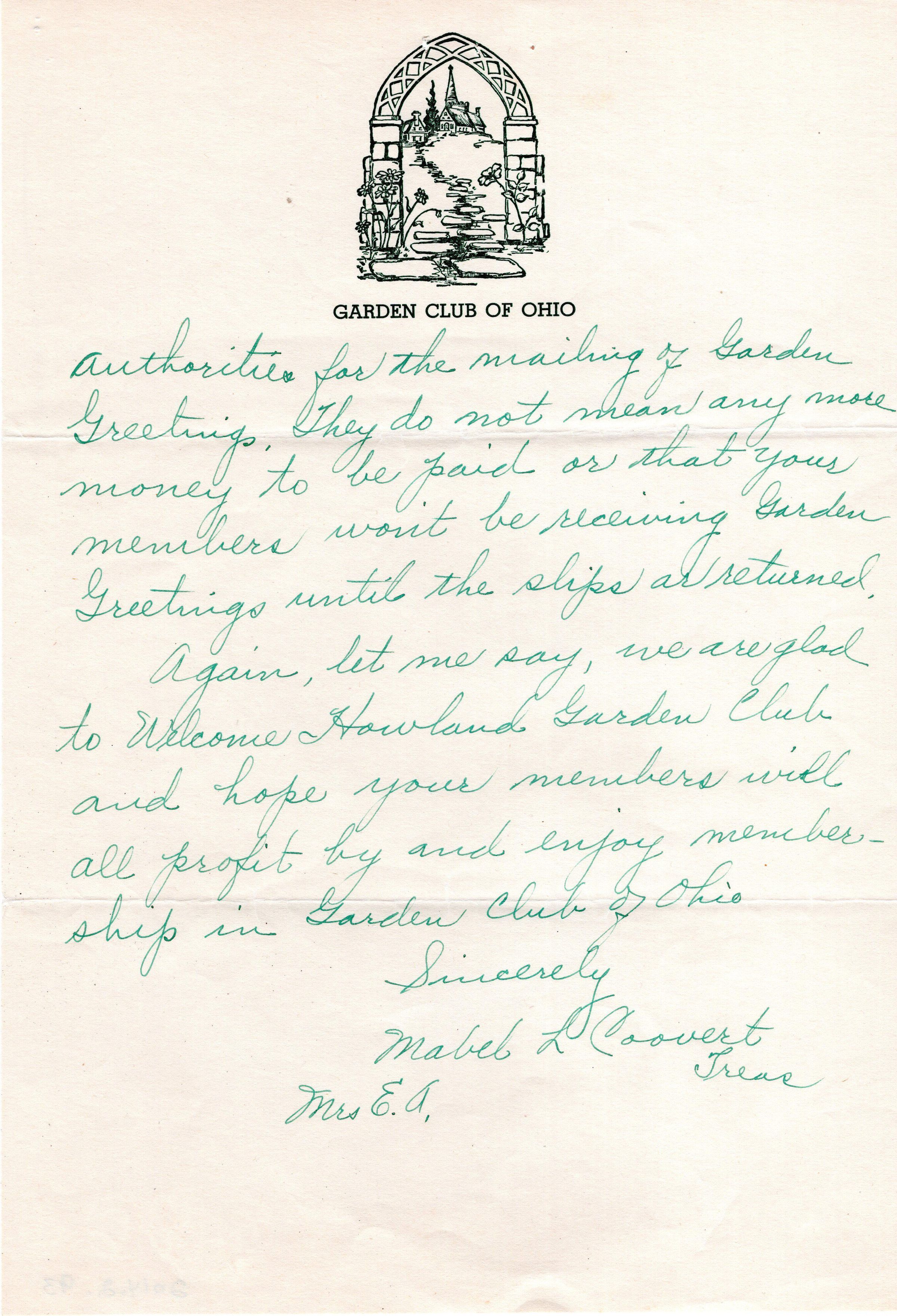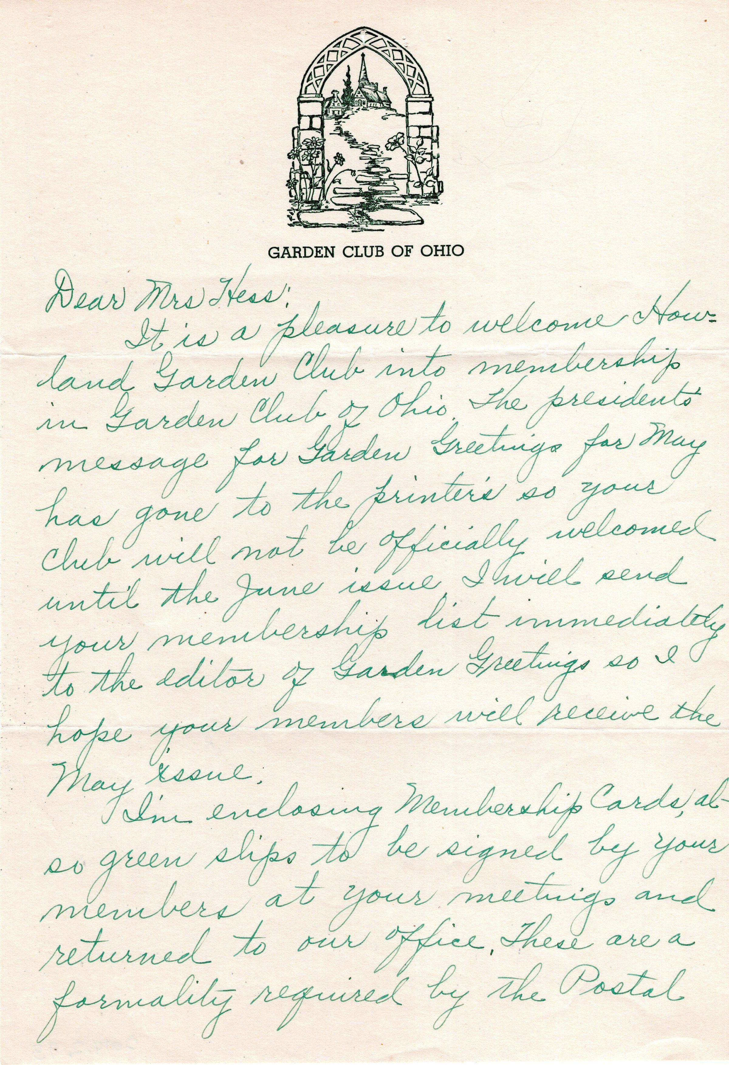 Welcome Letter to Howland Garden Club from Garden Club of Ohio