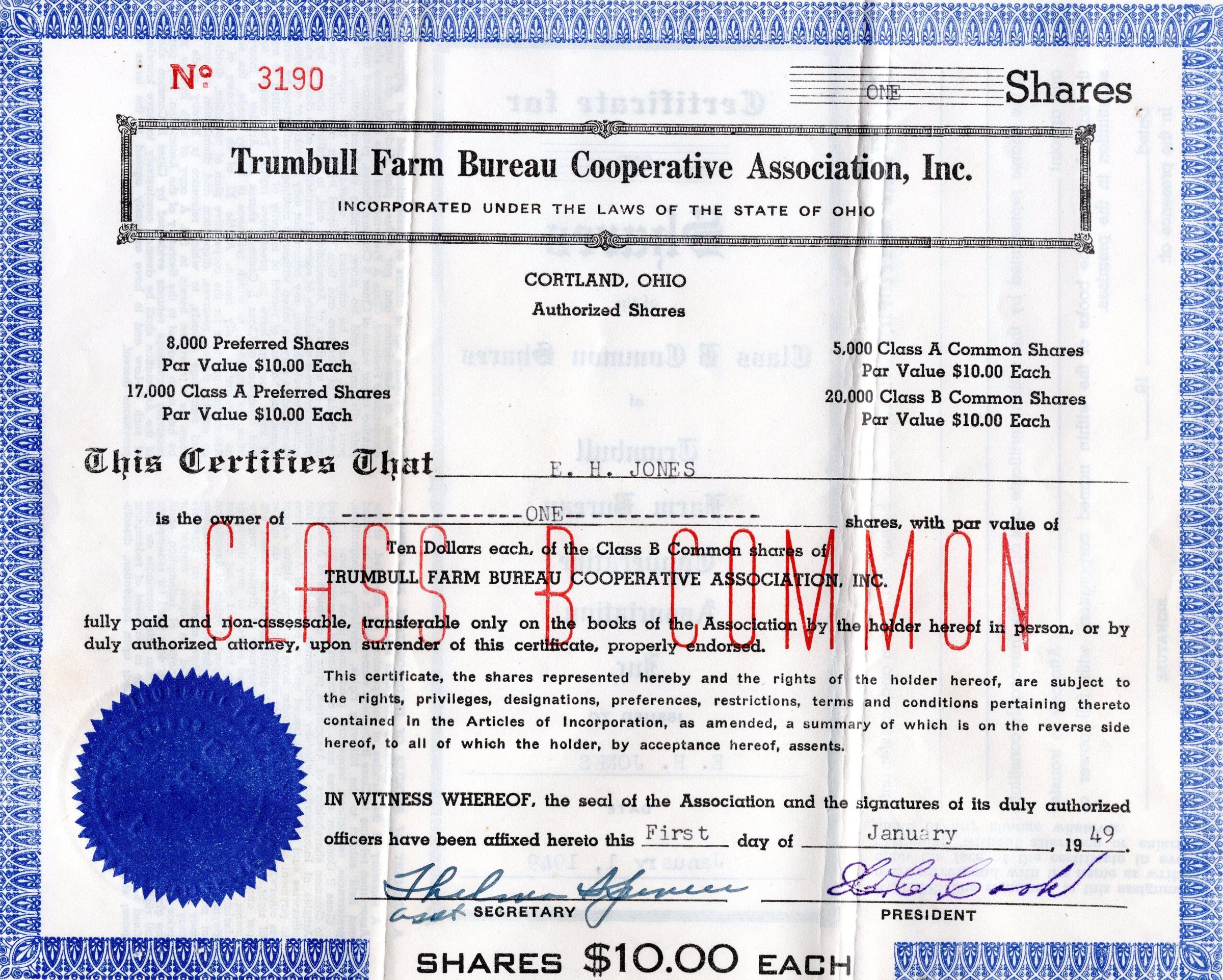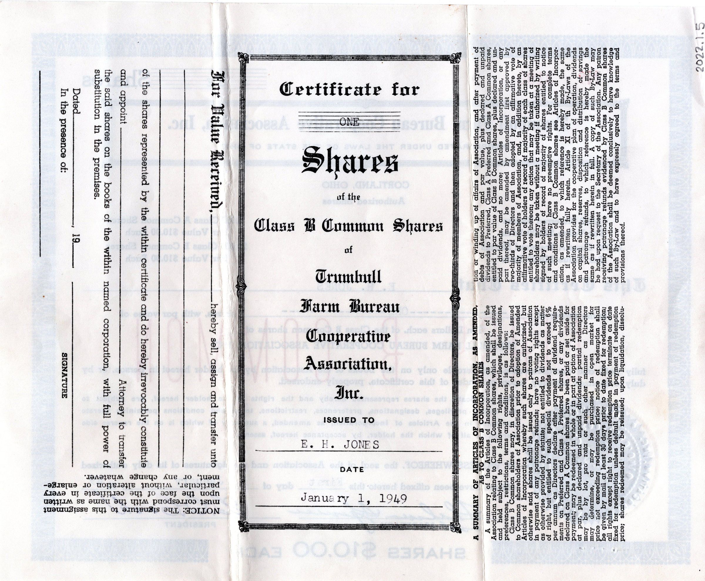 One share of stock in the Trumbull Farm Bureau Cooperative Association, Inc. to E.H. Jones in January 1949