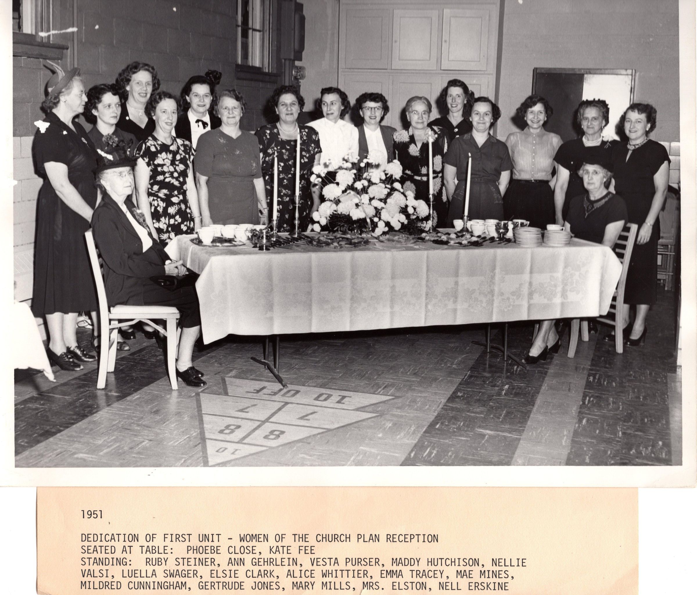Dedication of First Unit-Women plan reception:  Phoebe Close, Kate Fee, Ruby Steiner, Ann Gehrlein, Vesta Purser, Maddy Hutchison, Nellie Valsi, Luella Swager, Elsie Clark, Alice Whittier, Emma Tracey, Mae Mines, Mildred Cunningham, Gertrude Jones, Mary Mills, Mrs. Elston, Nell Erskine.
