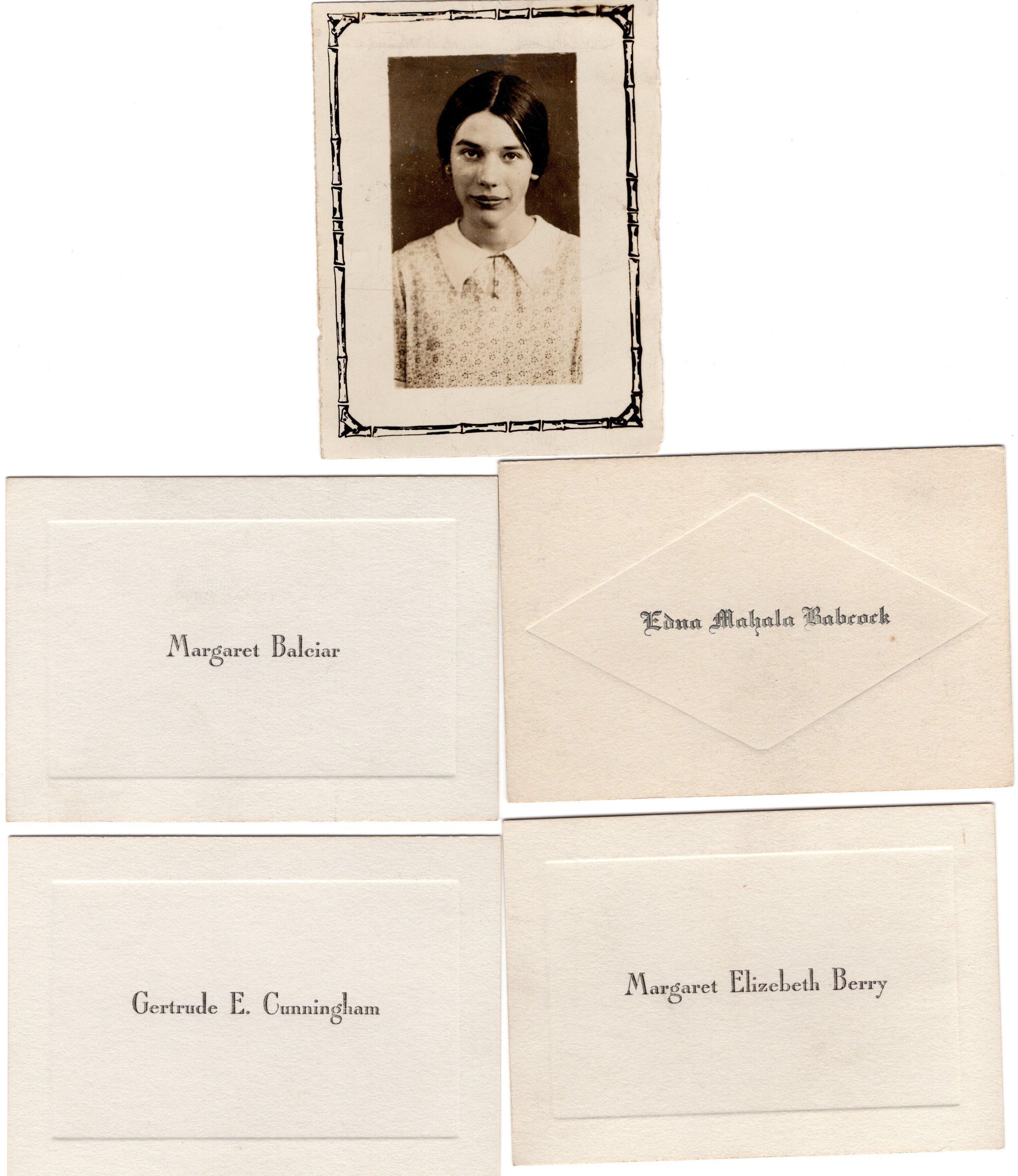 A collection of 35 calling cards and an unidentified photo.  Woman in photo may be the recipient of the calling cards. Occasion unknown. Items found box with name of McFarland's Art & Gift Shoppe.