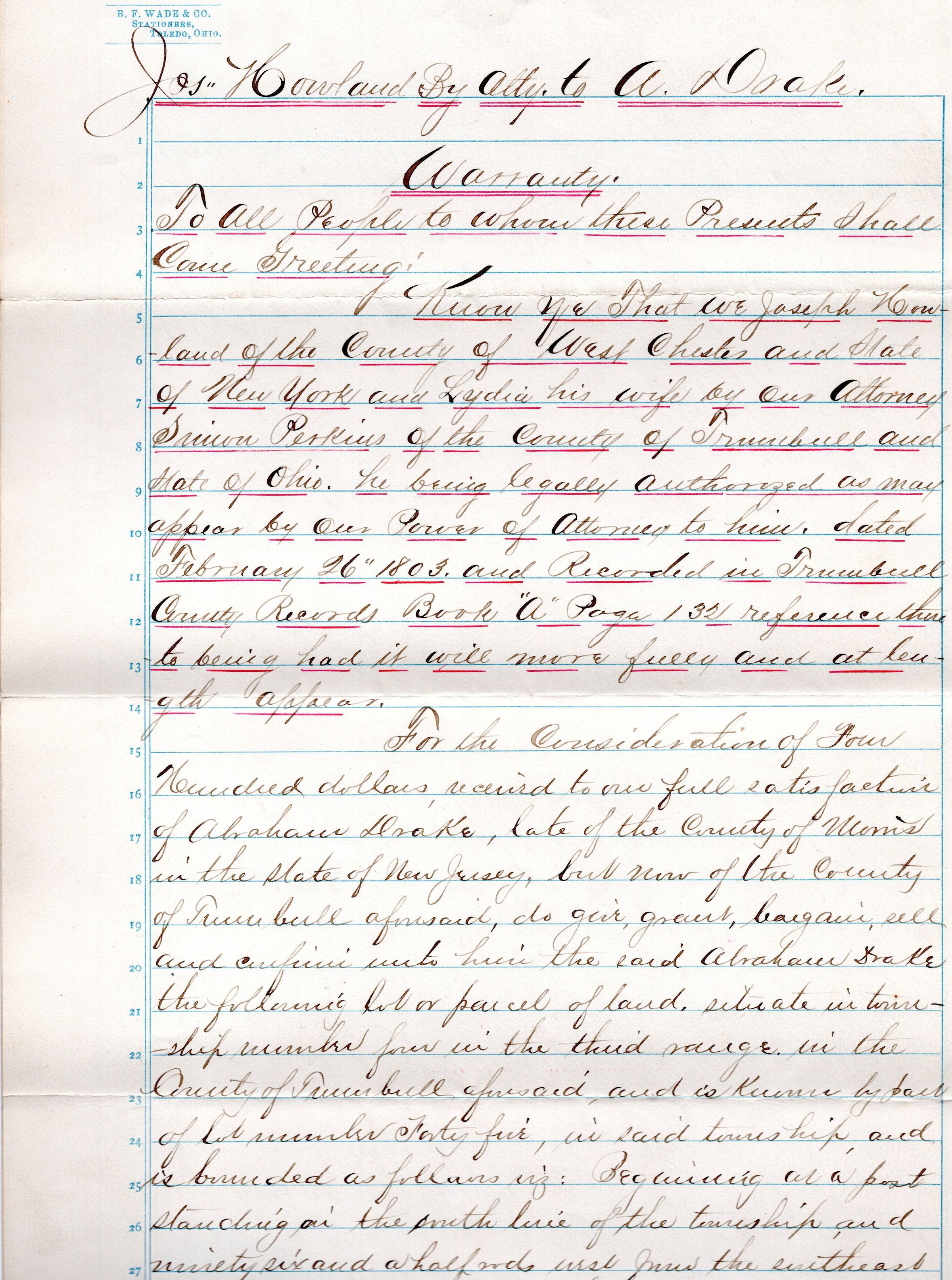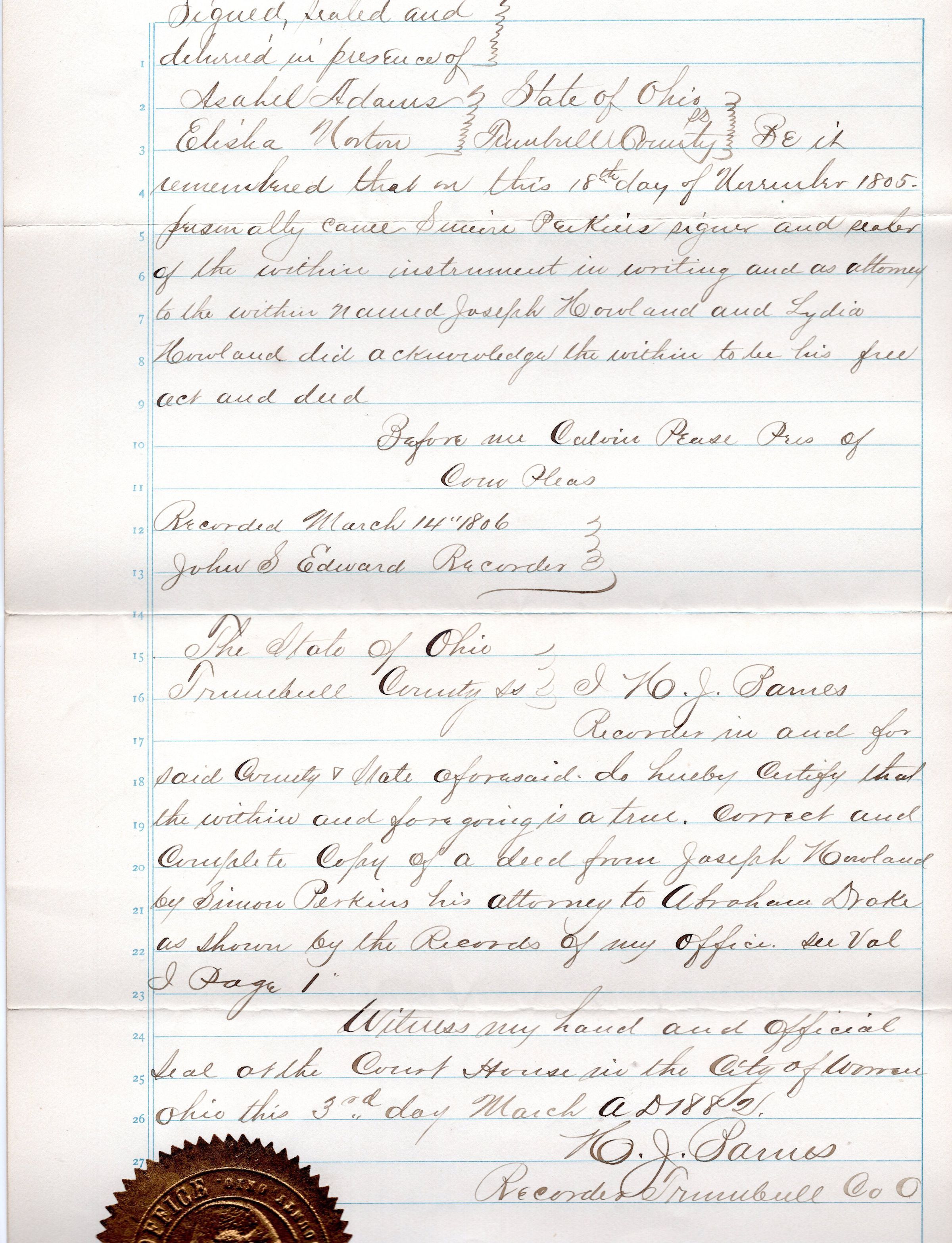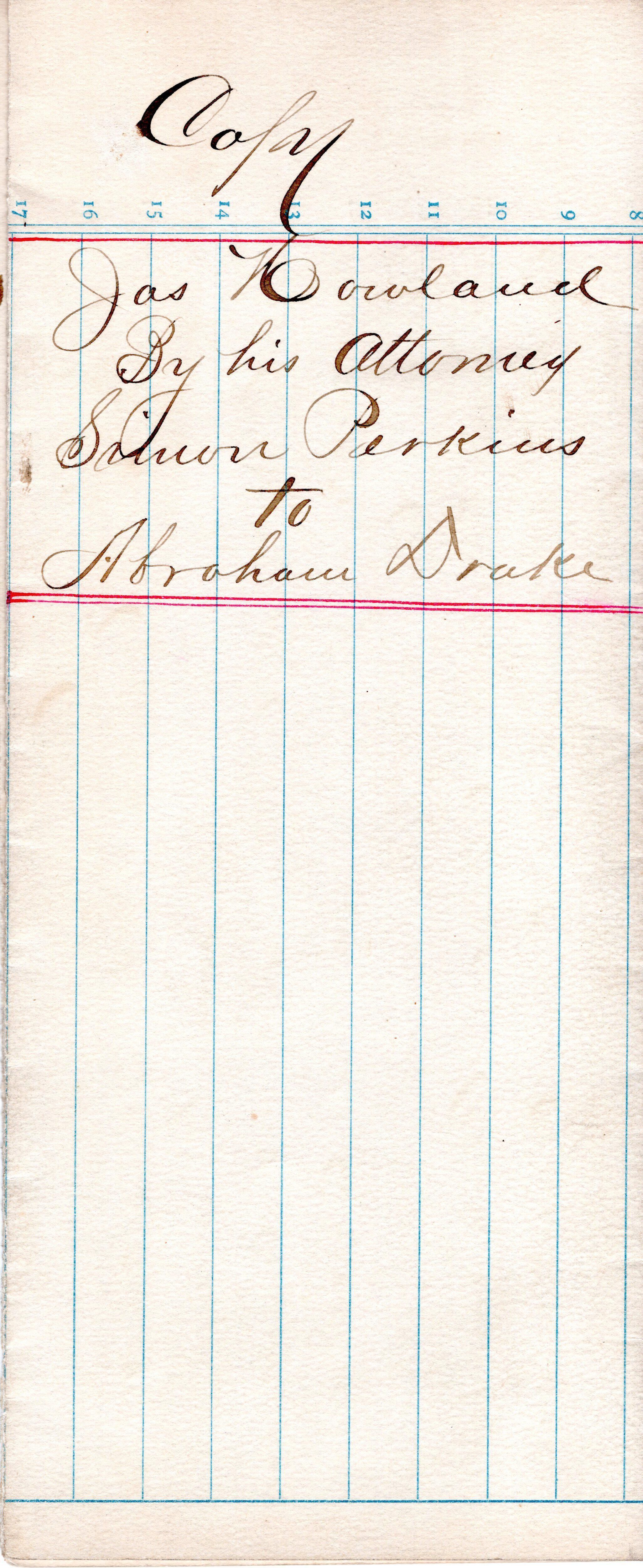 Warranty Deed Joseph Howland by His Attorney, Simon Perkins to Abraham Drake