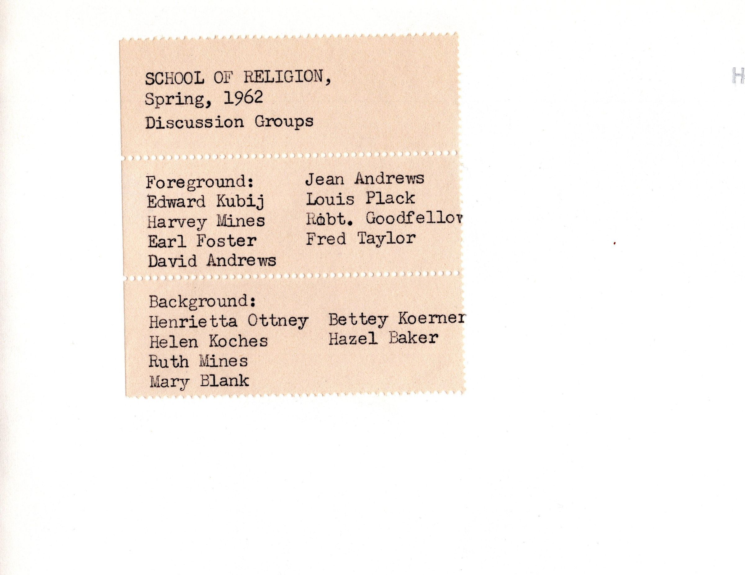 School of Religion, Spring 1962     Edward Kubij, Harvey Mines, Earl Foster, David Andrews, Jean Andrews, Louis Plack, Robt. Goodfellow, Fred Taylor, Henrietta Ottney, Helen Koches, Ruth Mines, Mary Blank, Bettey Koerner, Hazel Baker
