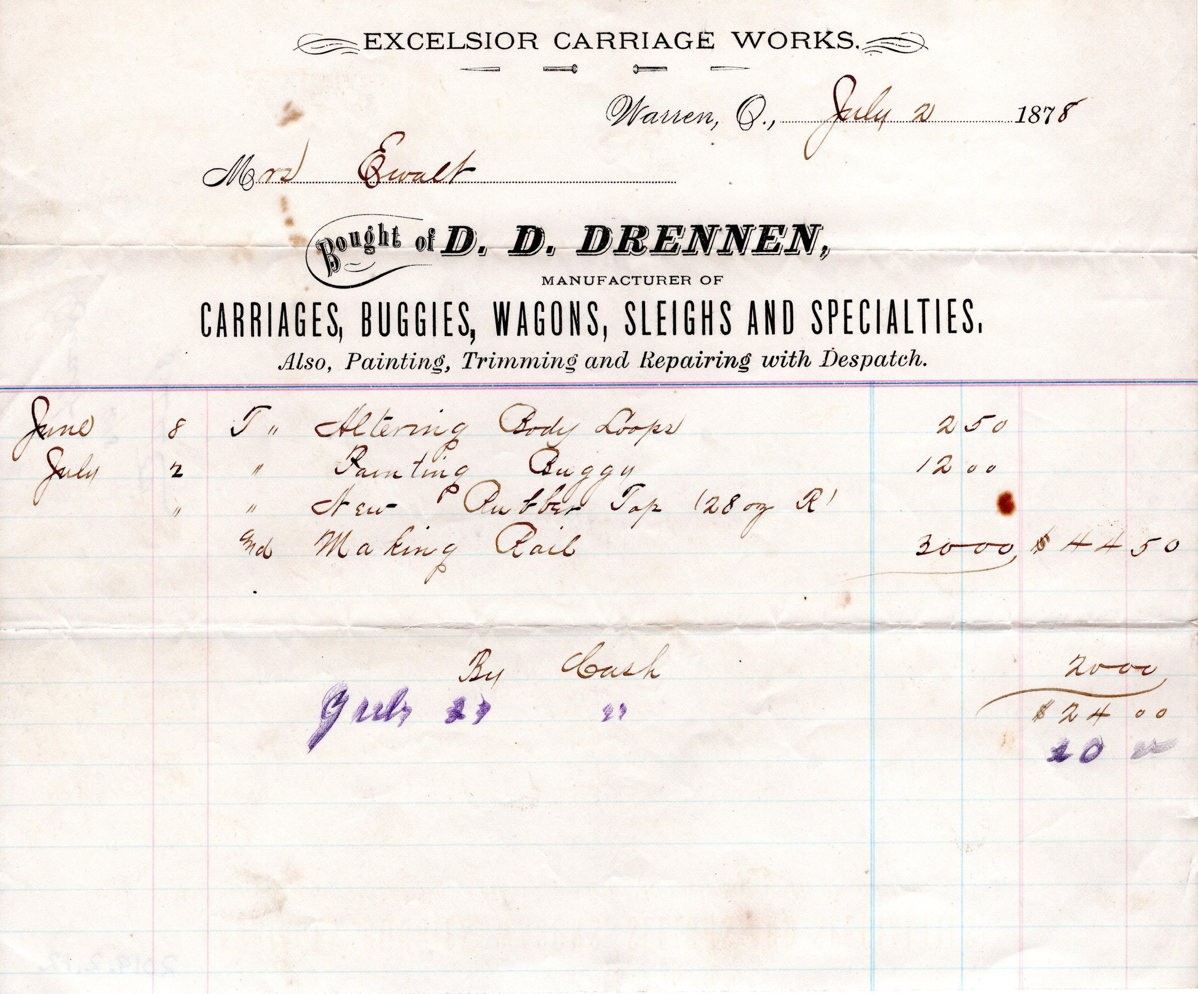 Receipt to Mrs. Ewalt for purchases from D.D. Drennen, Manufacturer of Carriages, Buggies, Wagons, Sleighs and SpecialtiesAcquisition