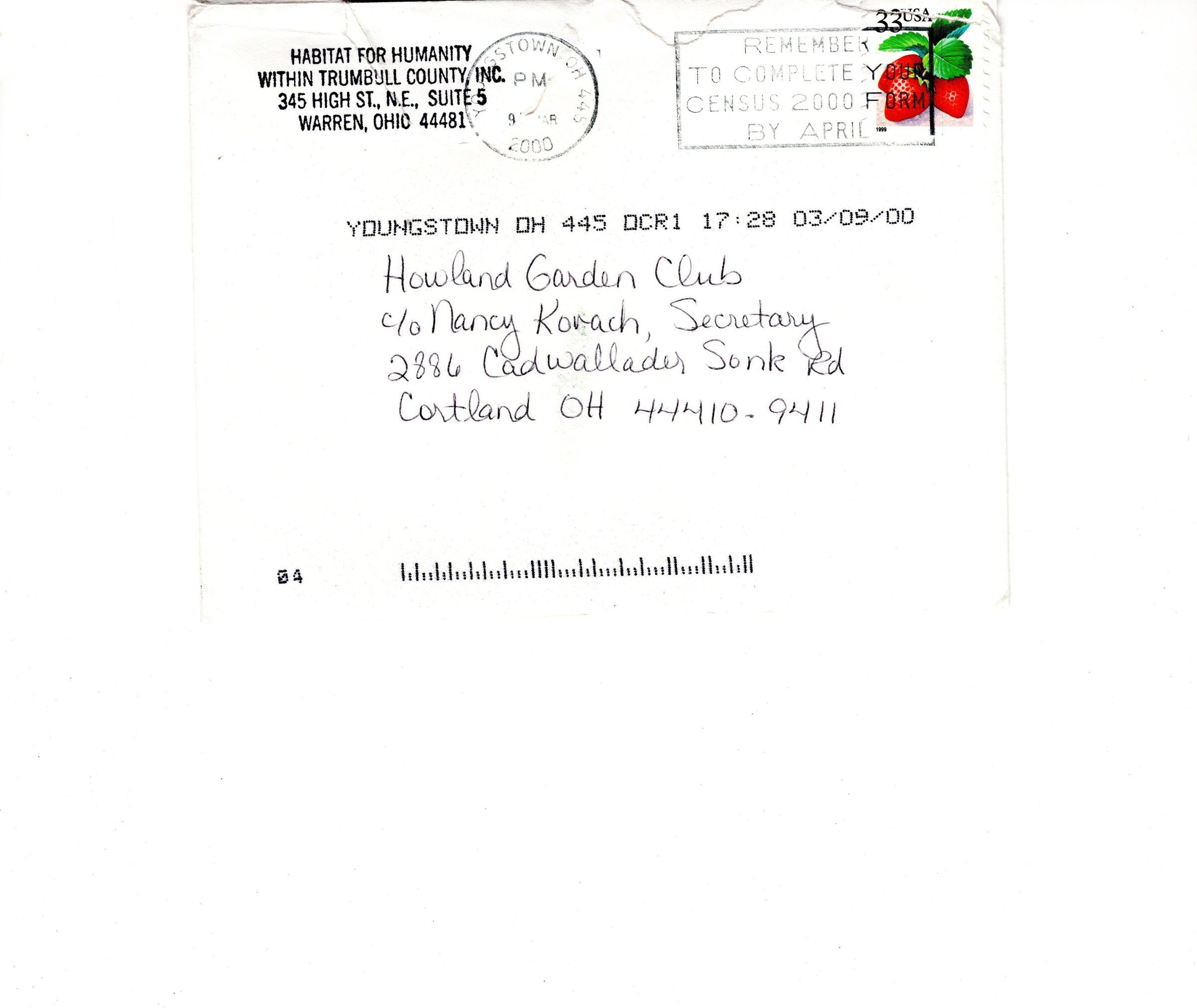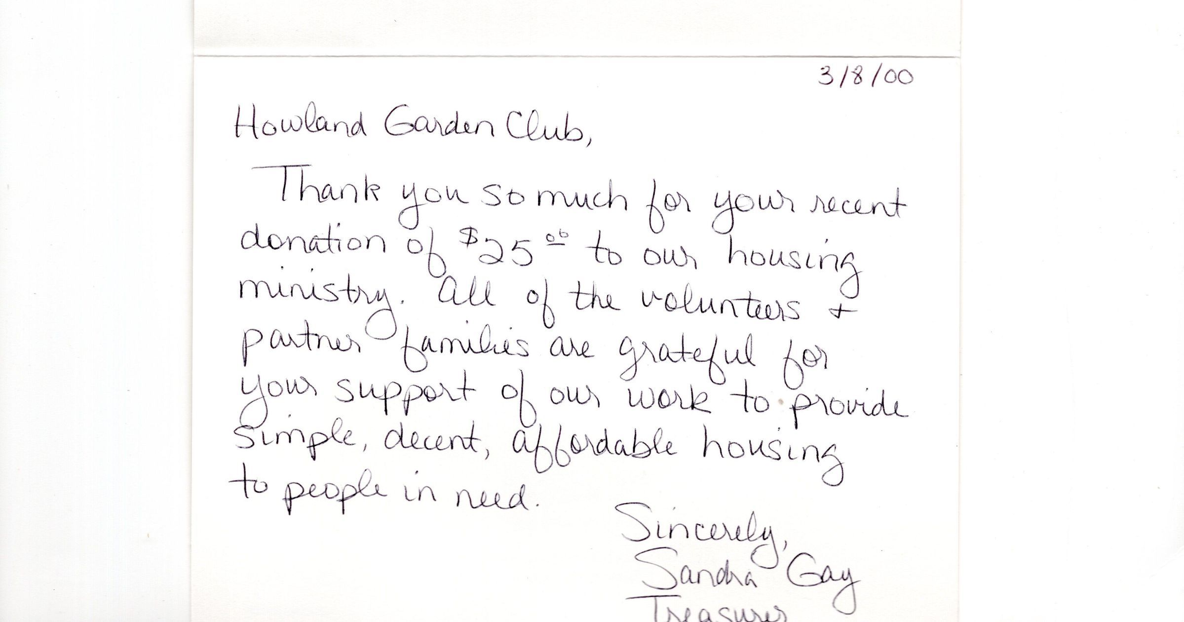 Thank you note to Howland Garden Club from Habitat for Humanity regarding donation.