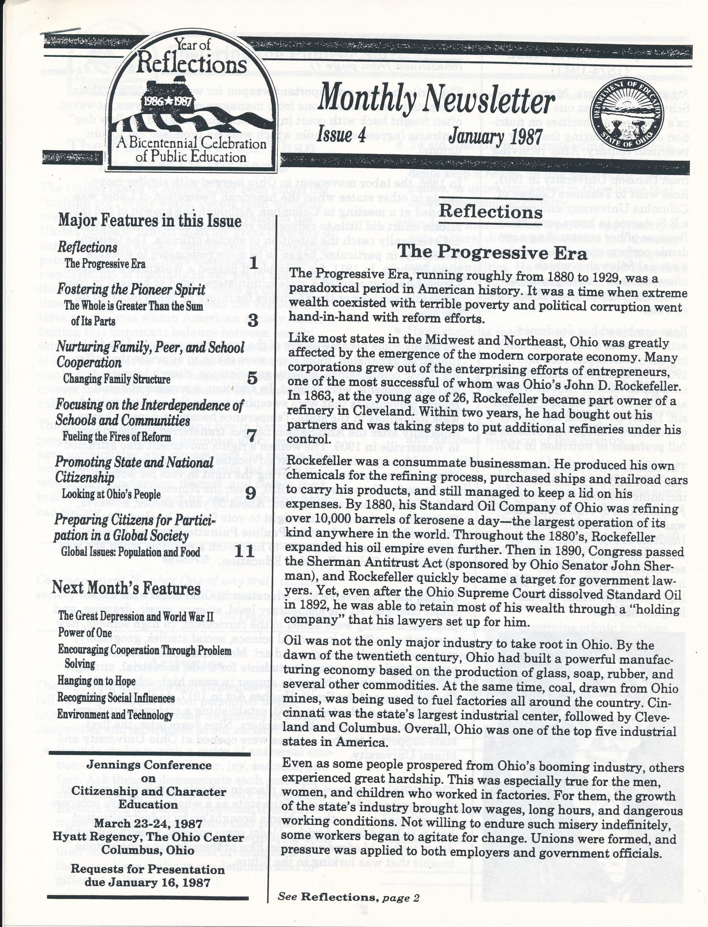 A Bicentennial Celebration of Public Education Monthly Newsletter Issue 4, January,1987 sent to Pat Agresta, Trumbull Board of Education.Acquisition