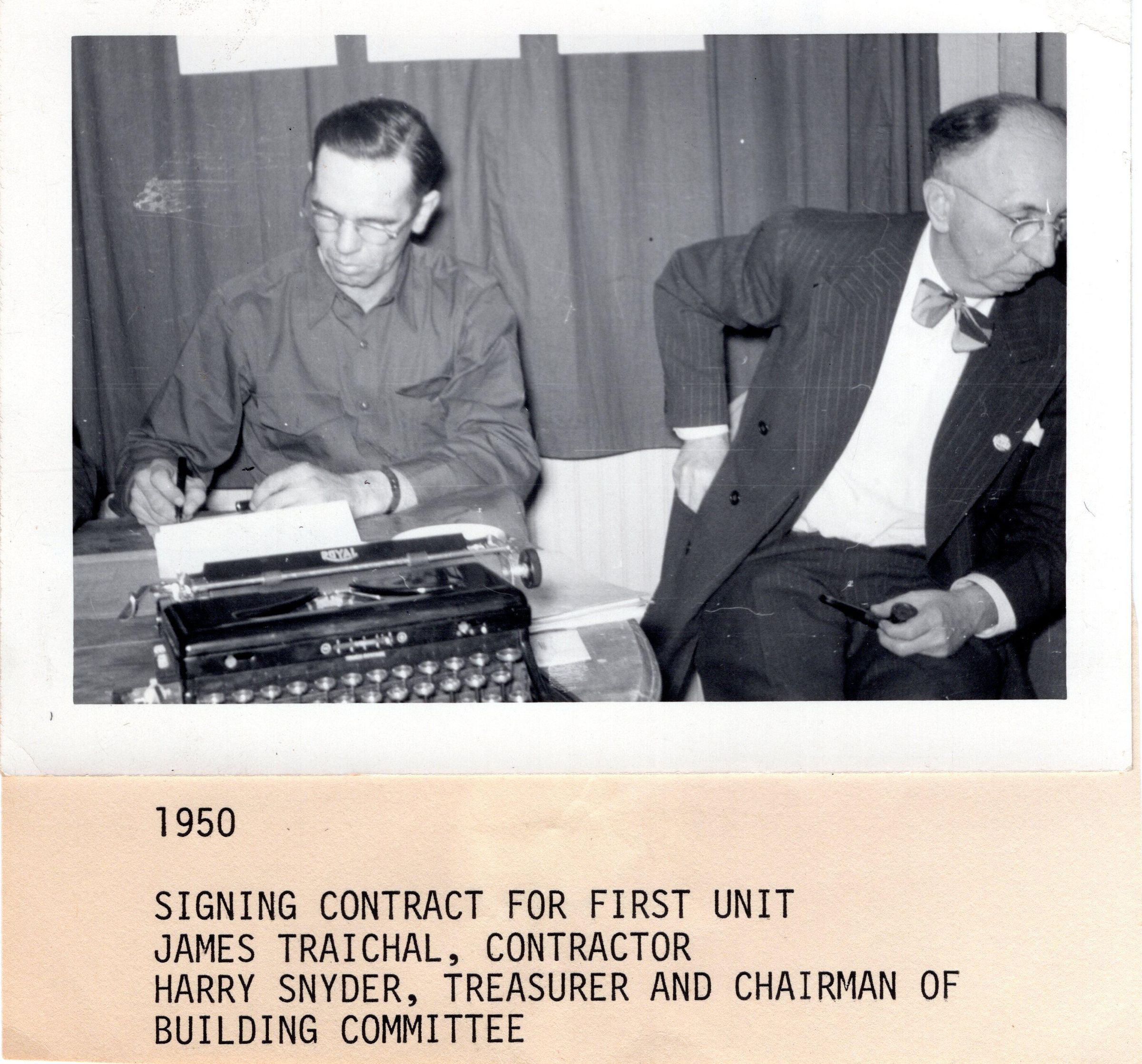 Signing Contract for First Unit James Traichal, Contractor Harry Snyder, Treasurer and Chairman of Bldg. Committee