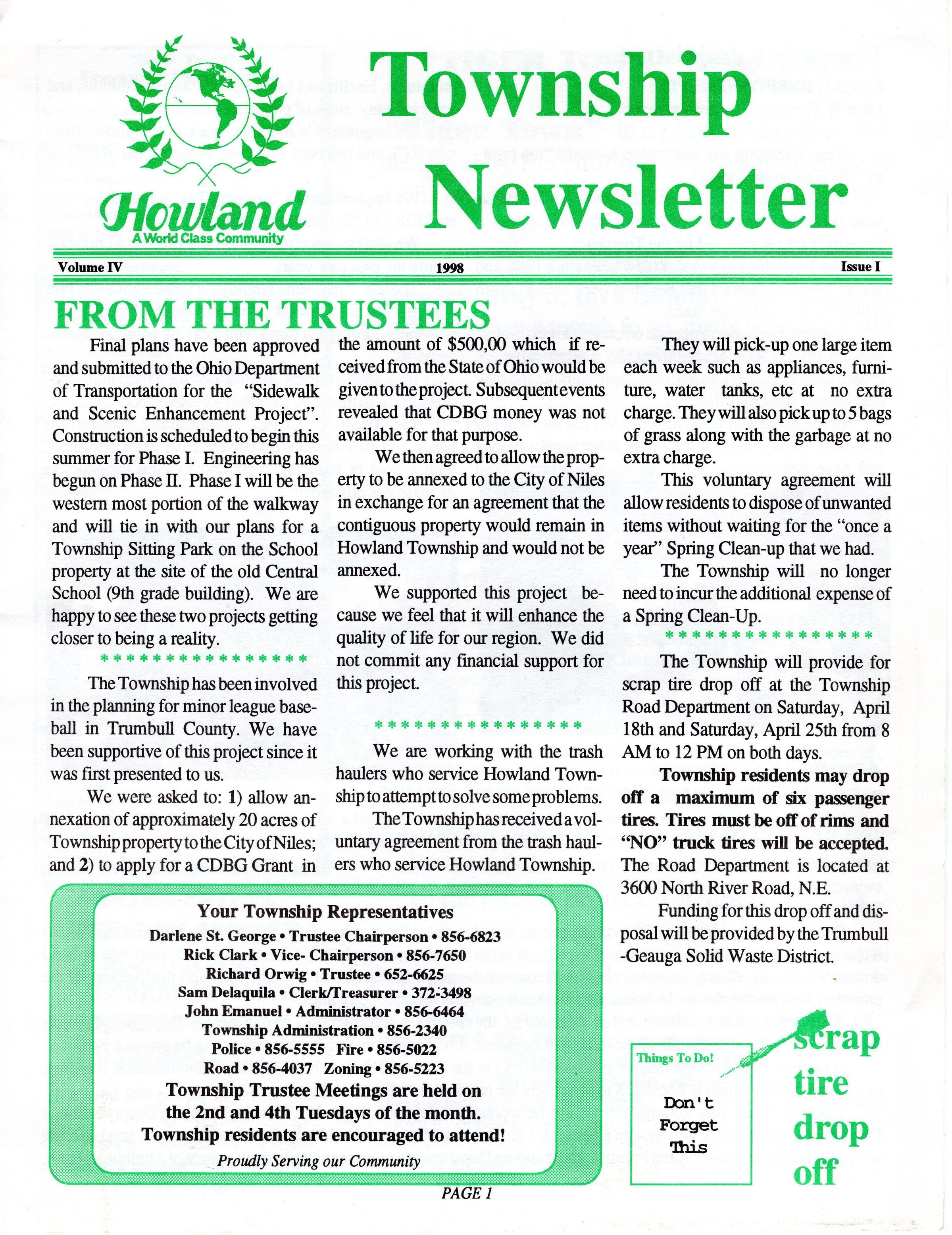 Howland Township Newsletter, Issue 1, Volume IV, 1998