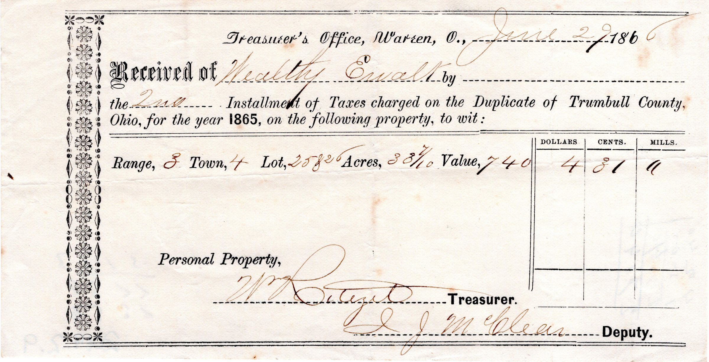 Receipt to Wealthy Ewalt for taxes paid to Trumbull County