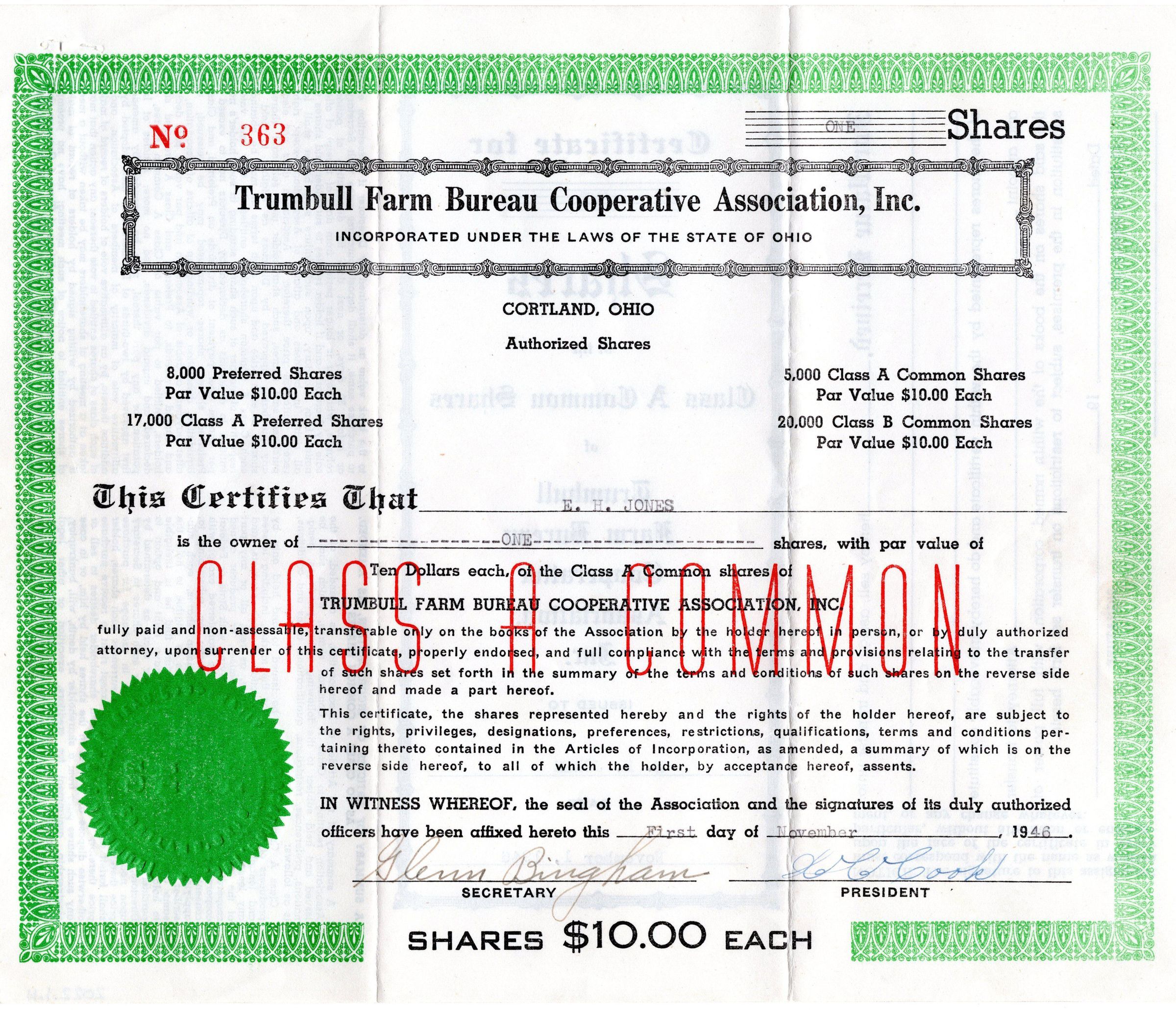 Certificate of One share in Trumbull Farm Bureau Cooperative Association to E H Jones November 1 1946