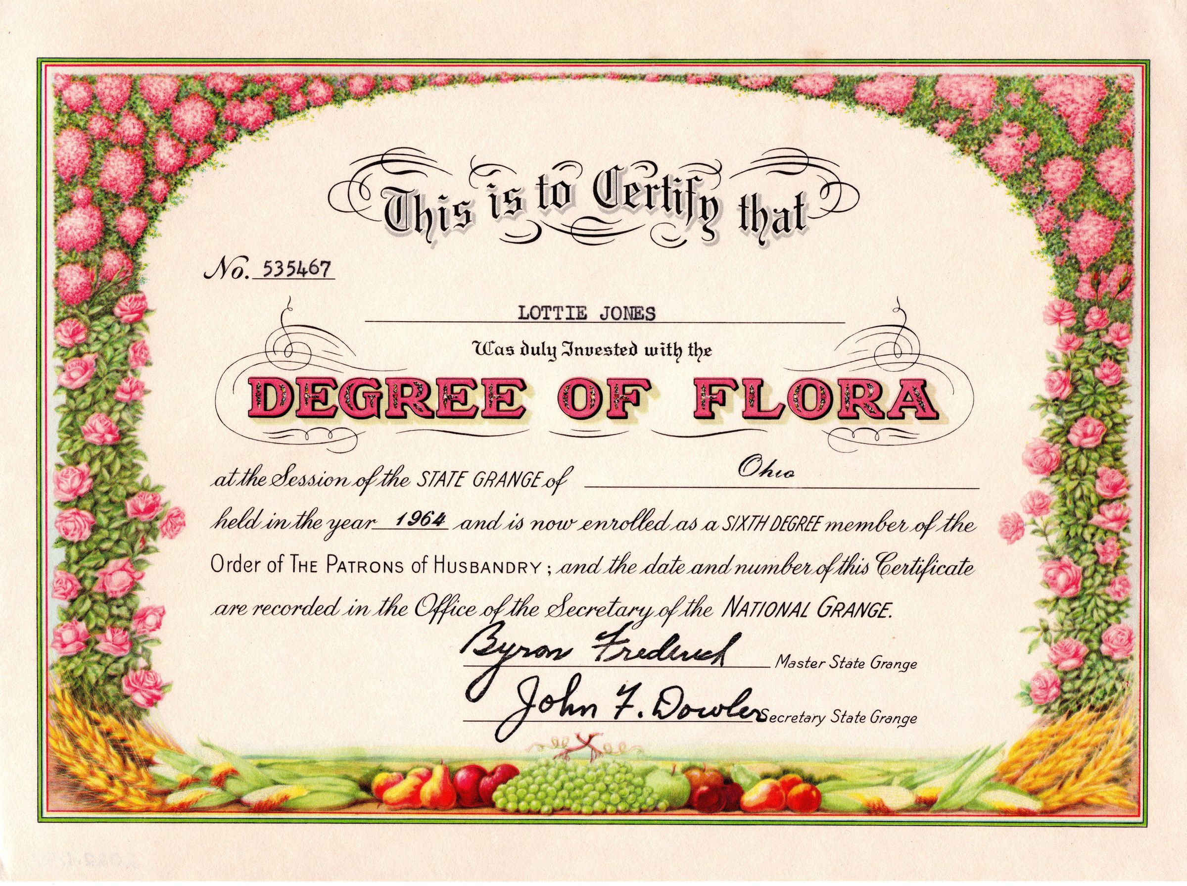 Certificate for Degree of Flora issued to Lottie Jones as Sixth Dree Member