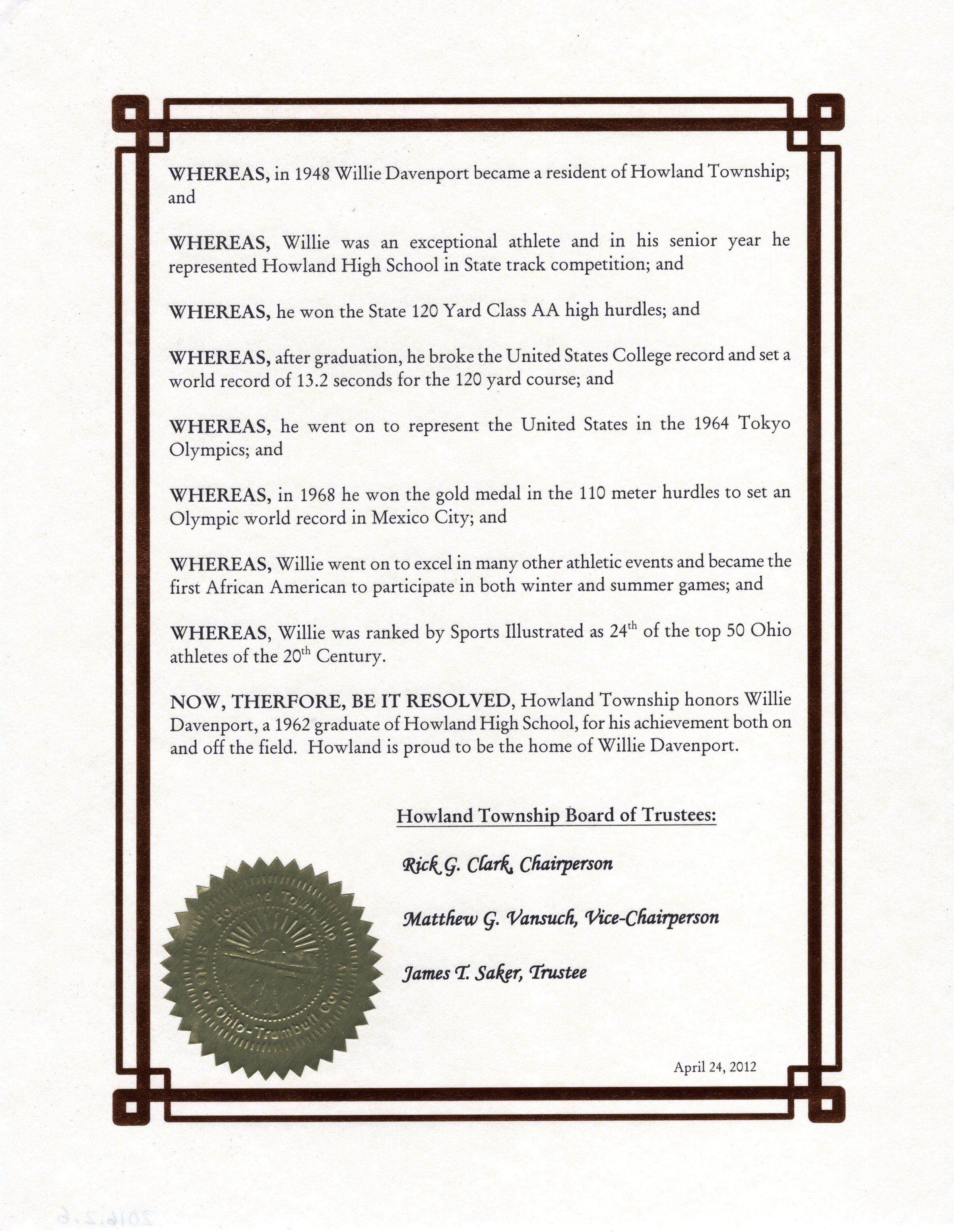 Certificate of Achievement to Willie Davenport from Howland Township Trustees