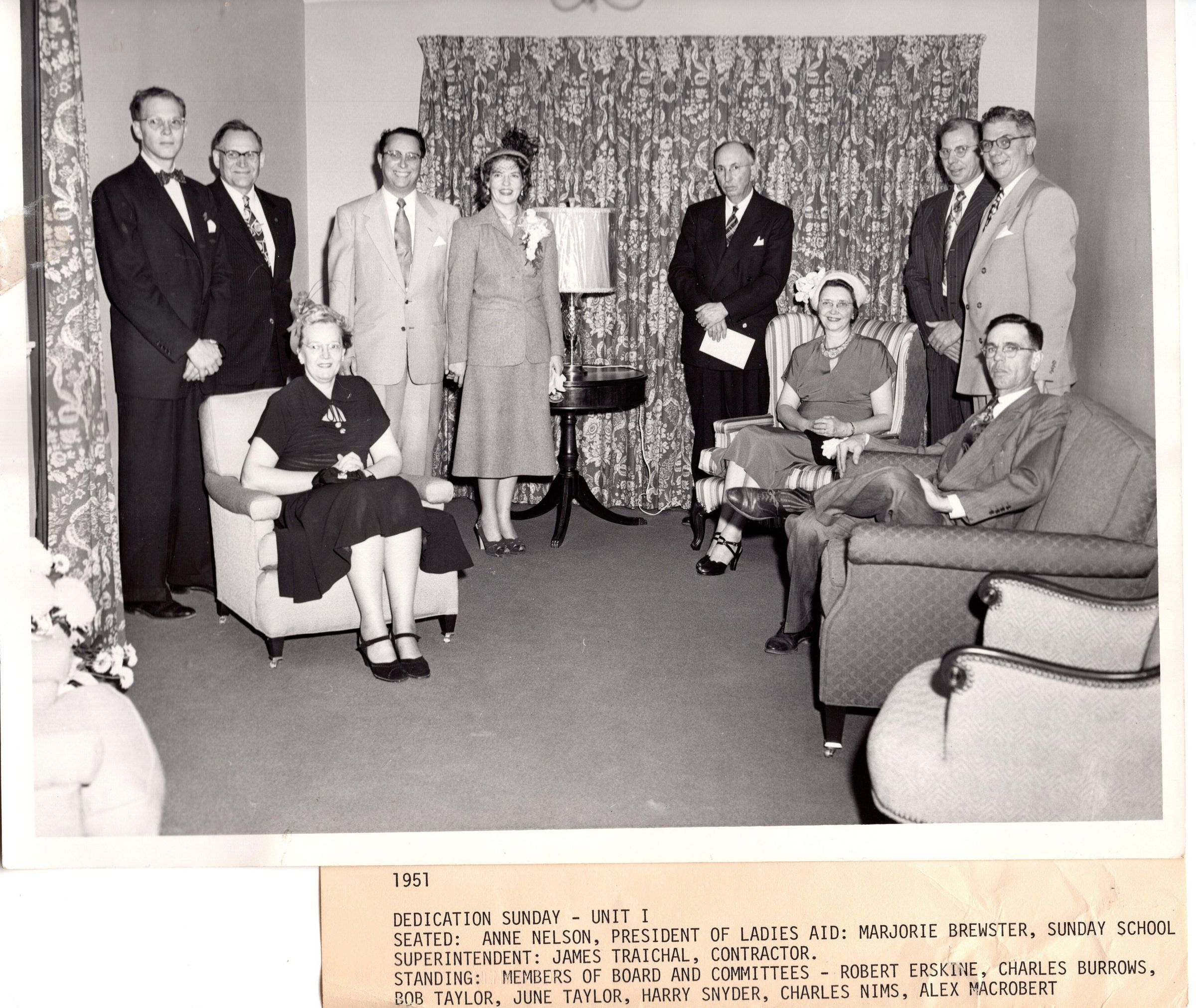 Dedication Sunday-Unit 1       Seated: Anne Nelson, Pres. Ladies Aid: Marjorie Brewster, Sunday School Superintendent; James Traichal, Contractor     Standing: Members of Board and Committeess - Robert Erskine, Charles Burrows, Robert Taylor, June Taylor, Harry Snyder, Charles Nims, Alex Macrobert