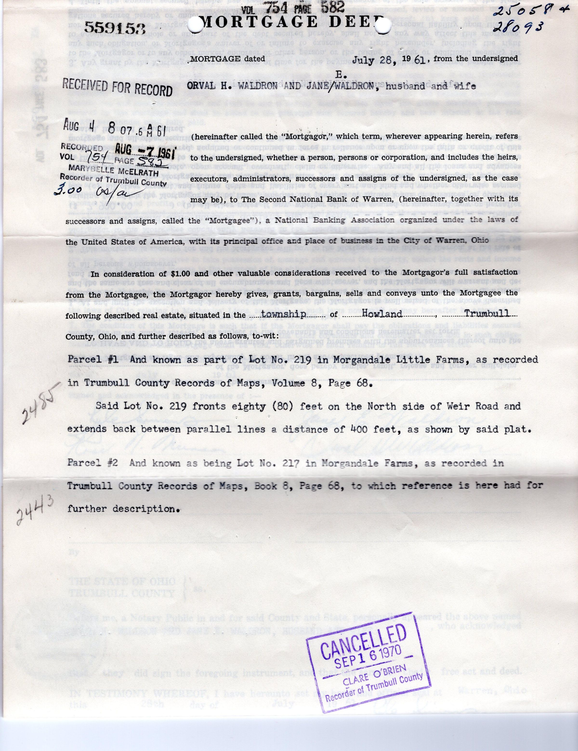 Waldron Mortgage Deed with The Second National Bank, July 28,1961 and Recorded August 7, 1961