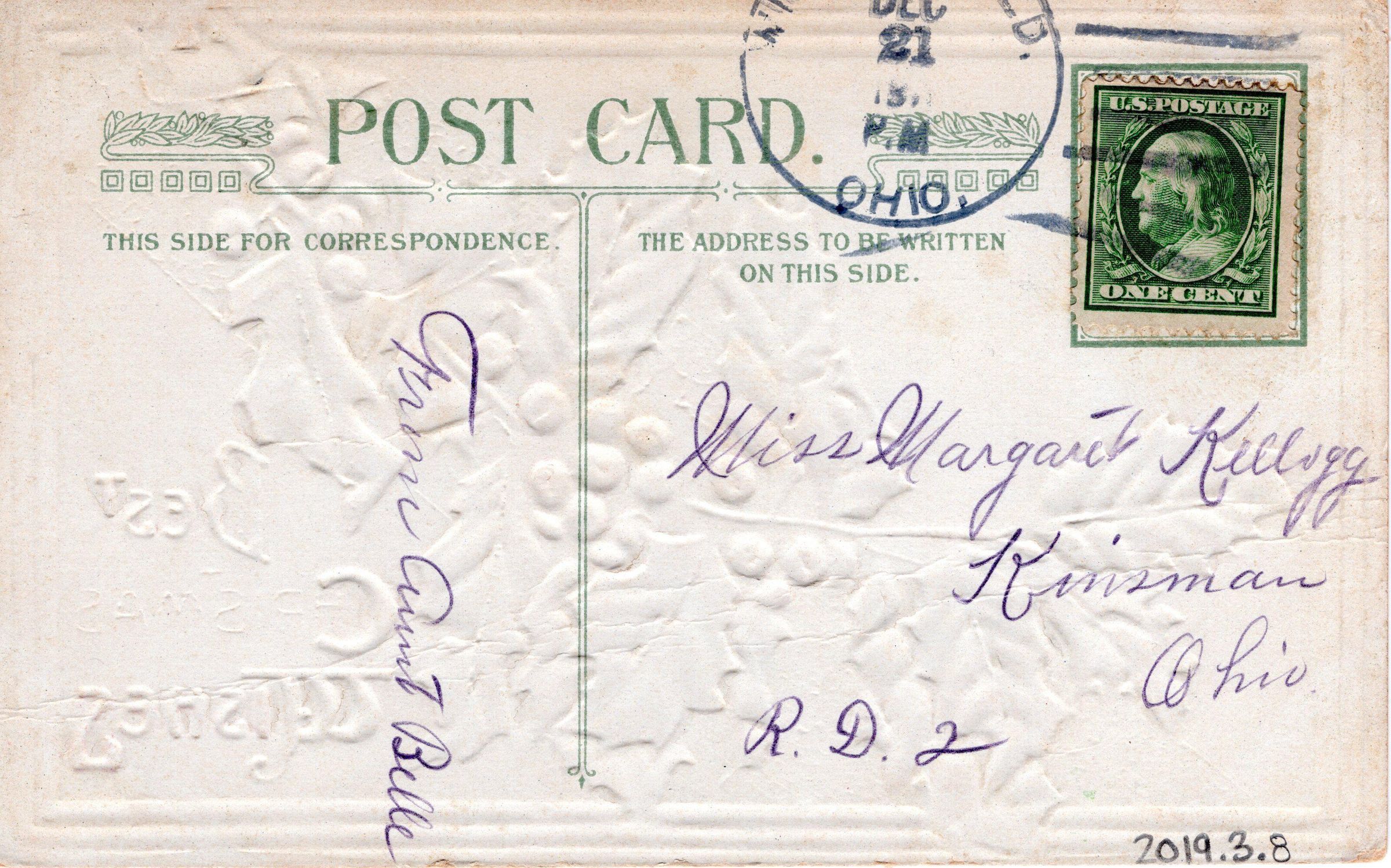 Christmas postcard to Margaret Kellogg from Aunt Belle