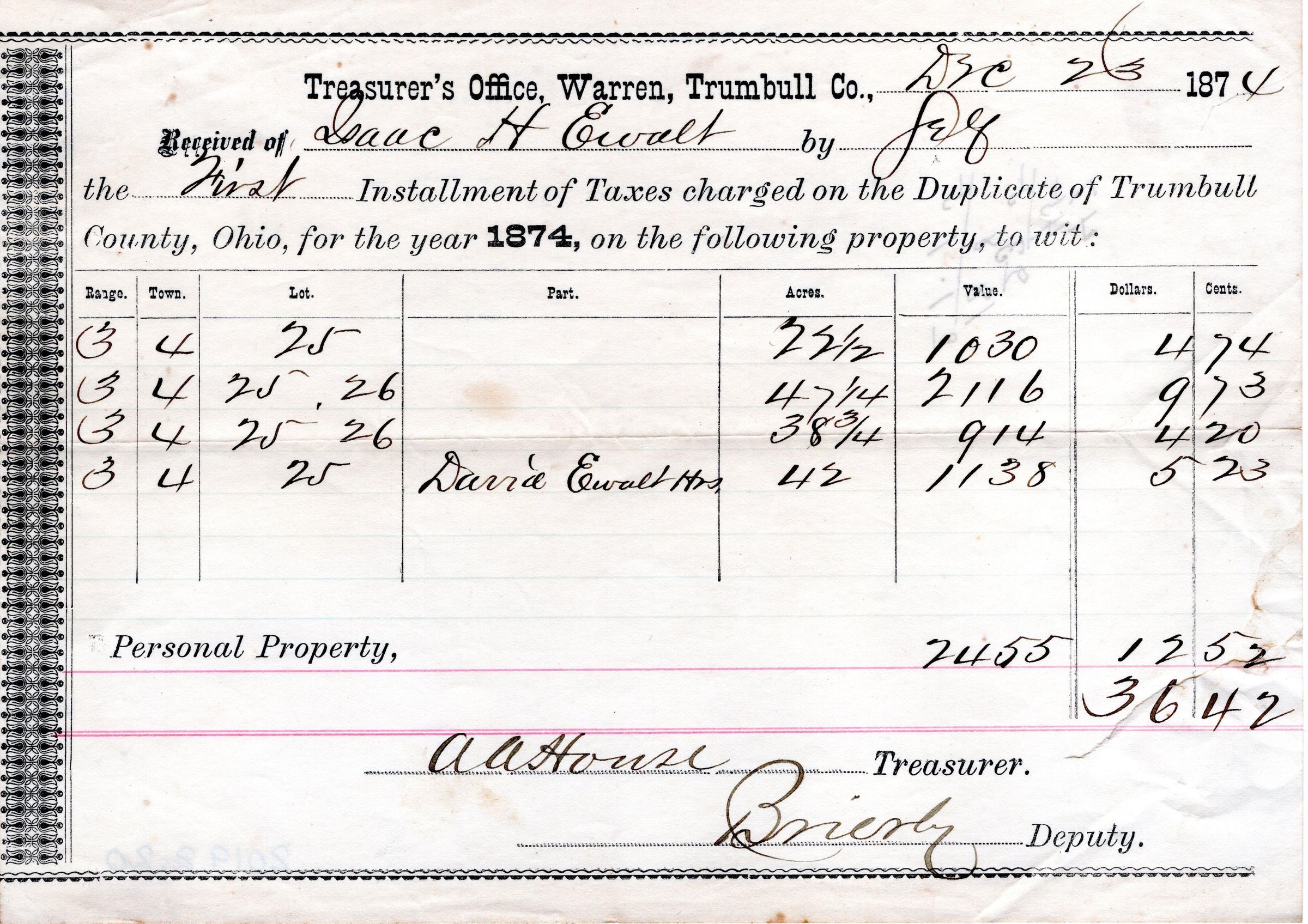 Tax payment receipt to Isaac H Ewalt from Trumbull County