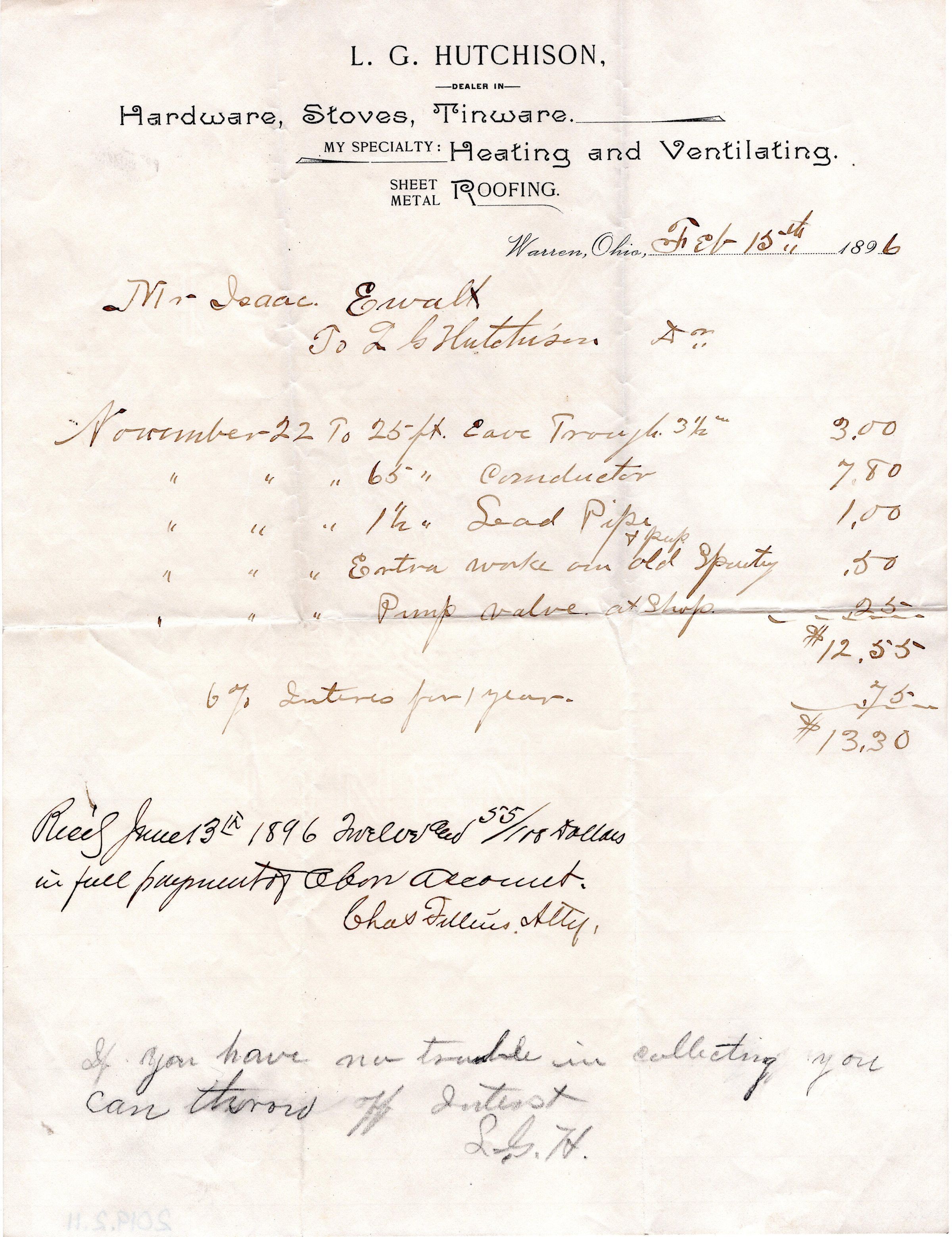Receipt to Isaac Ewalt for purchases from L.G. Hutchison, dealer in Hardware, Stoves, Tinware.  Specialty: Heating, Venltilating, RoofingAcquisition