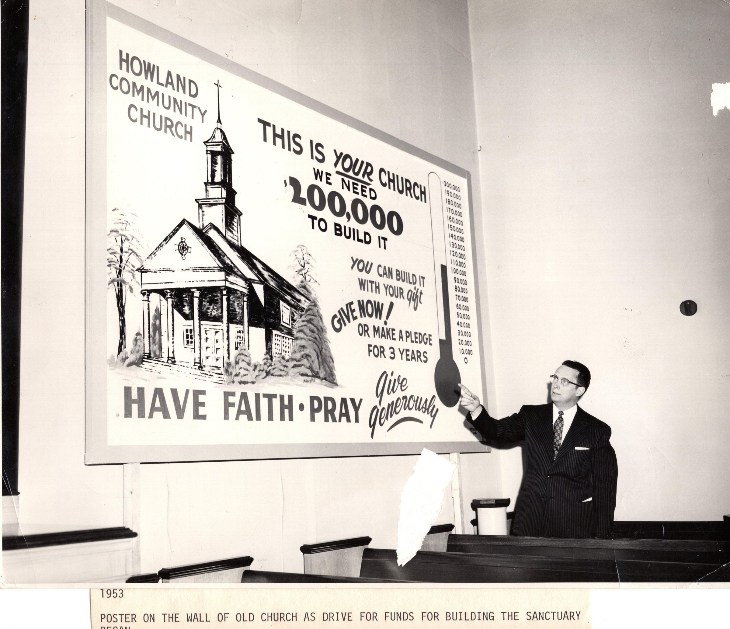 Poster on the wall of Old Church as drive for funds for building the sanctuary began.