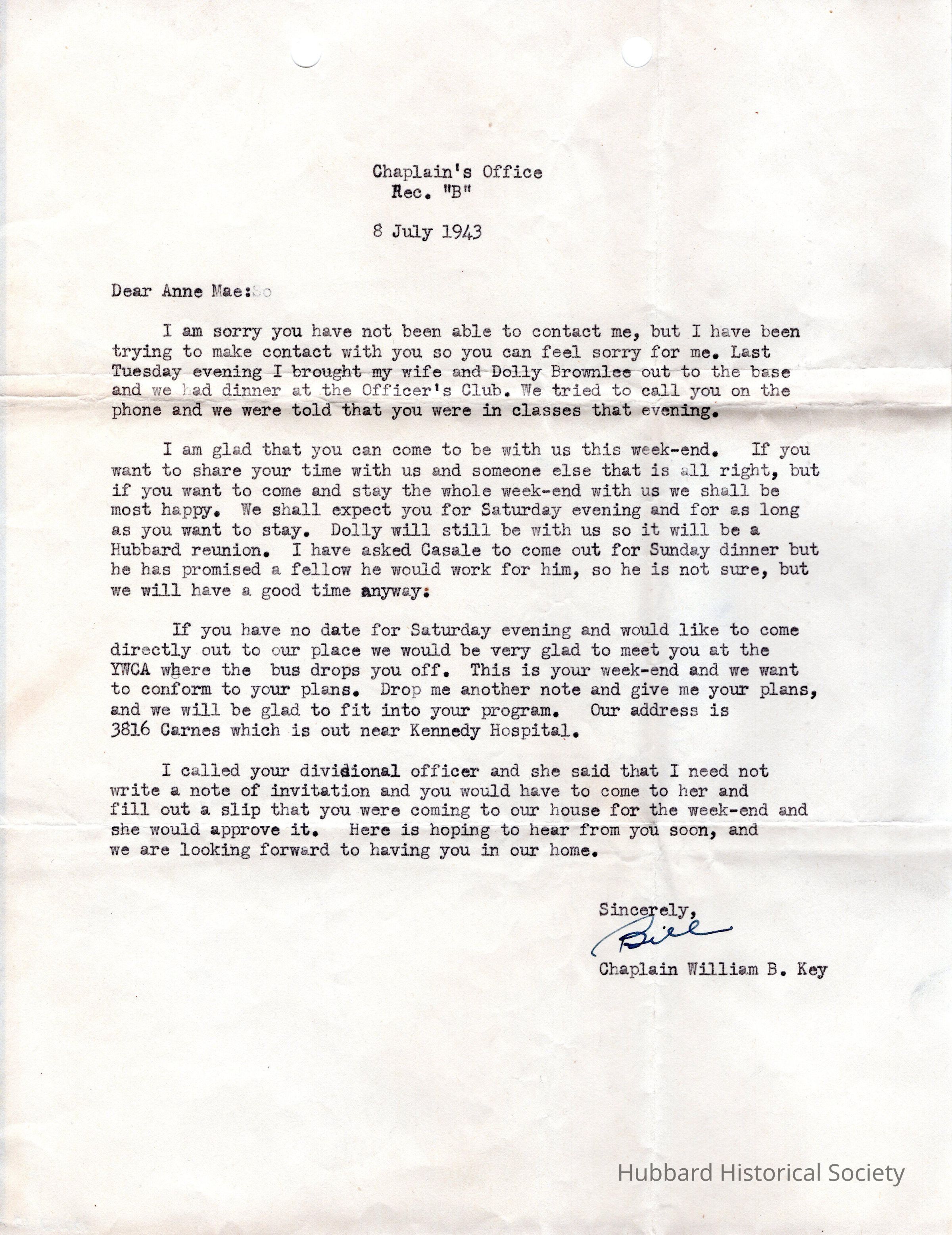 Letter from Chaplain William B. Key to Anne Mae dated July 8, 1943Cataloged By