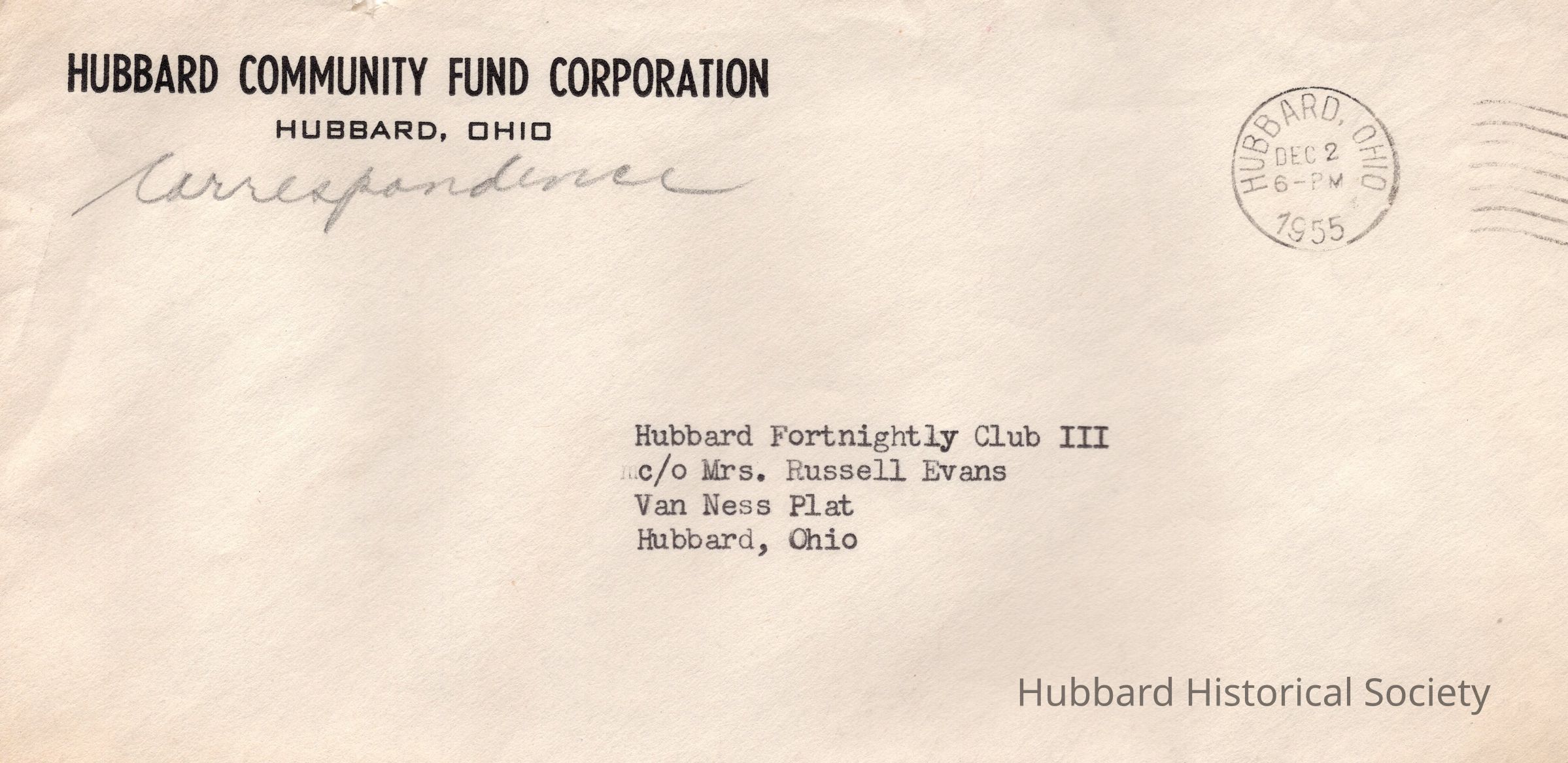Letters from Hubbard Community Fund Corporation to Fortnightly III regarding donation to Hubbard Community Chest.Cataloged By