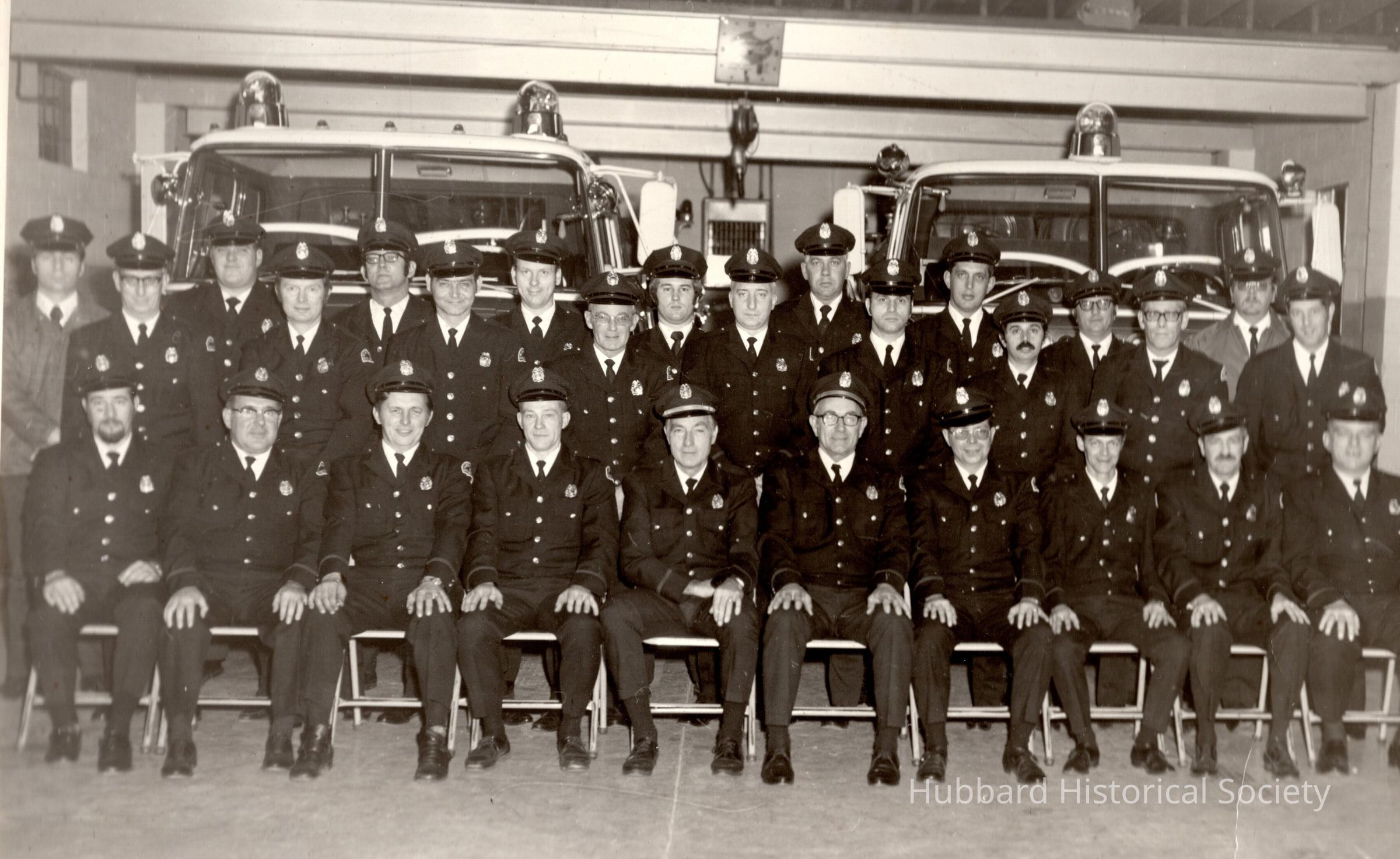 Hubbard Fire Department, Emerson Tobey, Bill Mason, Don Hardin, Jerome Tobey, Robert Strachan, Leonard Stevenson, Fred Harrison, James Davis, Russell Thomas, Tom Quinn, Patrick Bresnahan, William Harry, Ray Wells, Geore Whittle, George Whittle, Jack Bolchalk, Ray Wilt, Don Stewart, Don Thomas, Jake Squibbs, Richard Lowry, Tom O'Neil, Bill Chmelik, Tom Albani, Jack Stabile, Bill Gontaruk, Ed Snyder, Jerry ResatarNotes