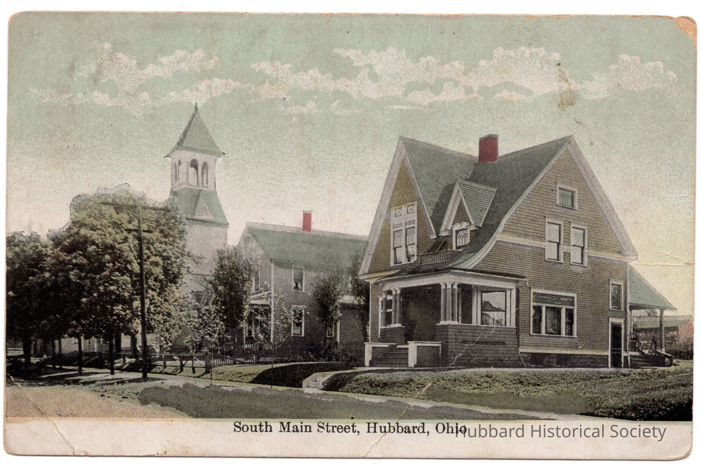 Postcard showing church and two homes on South Main Street, dated Feb. 27, 2011; to Mrs. Mealy, Girard, from Alice.Cataloged By