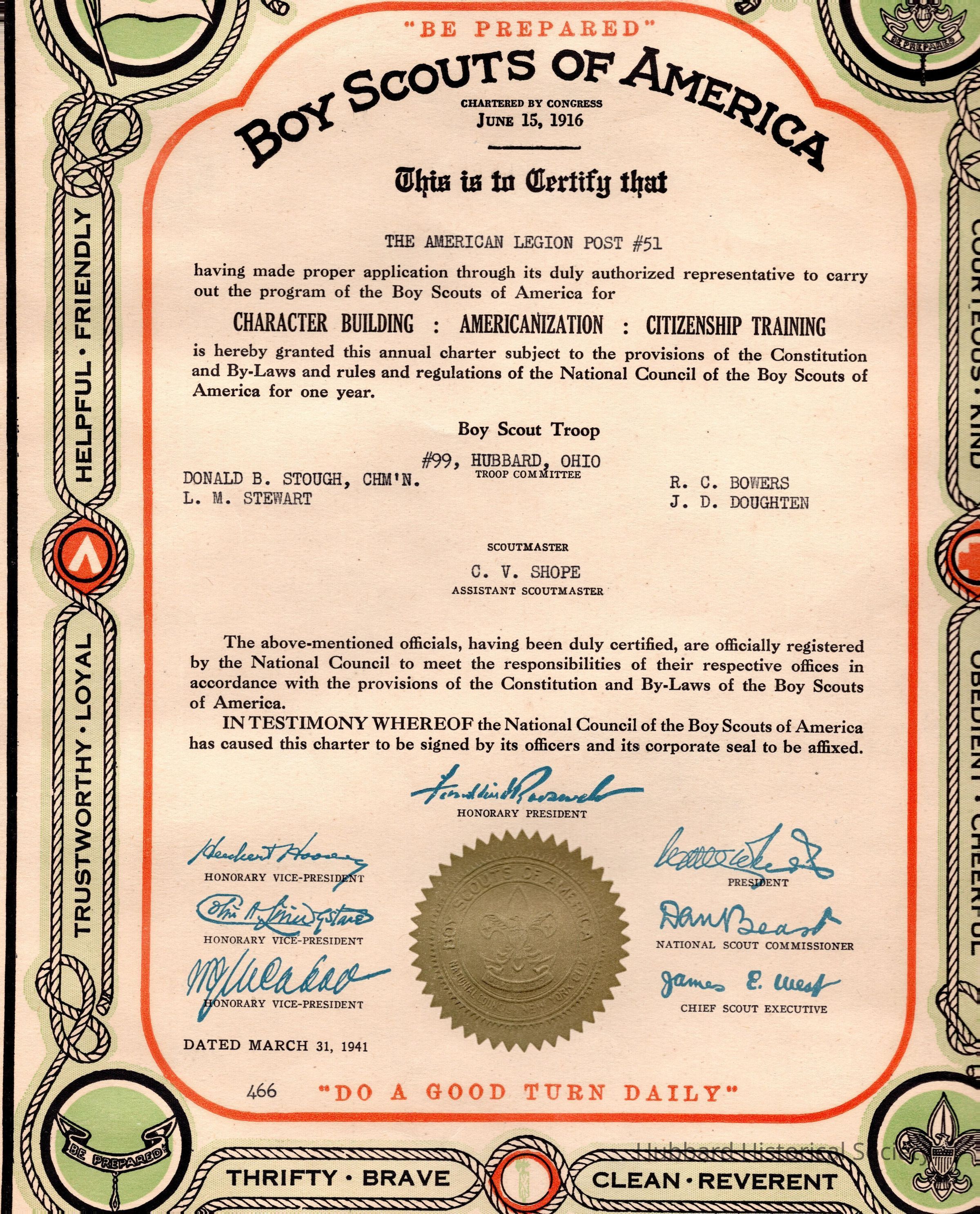 Boy Scout Troop #99 1941 charter The American Legion Post #51