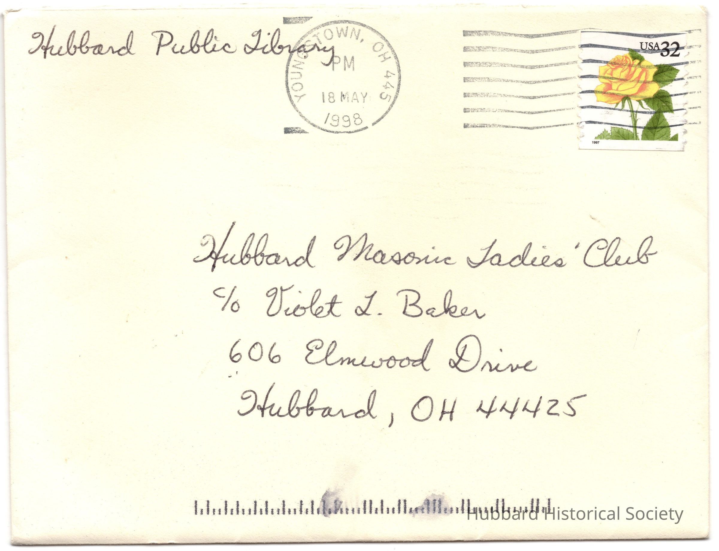 Letter from Hubbard Public Library to Hubbard Masonic Ladies Club regarding a memorial donation.Cataloged By